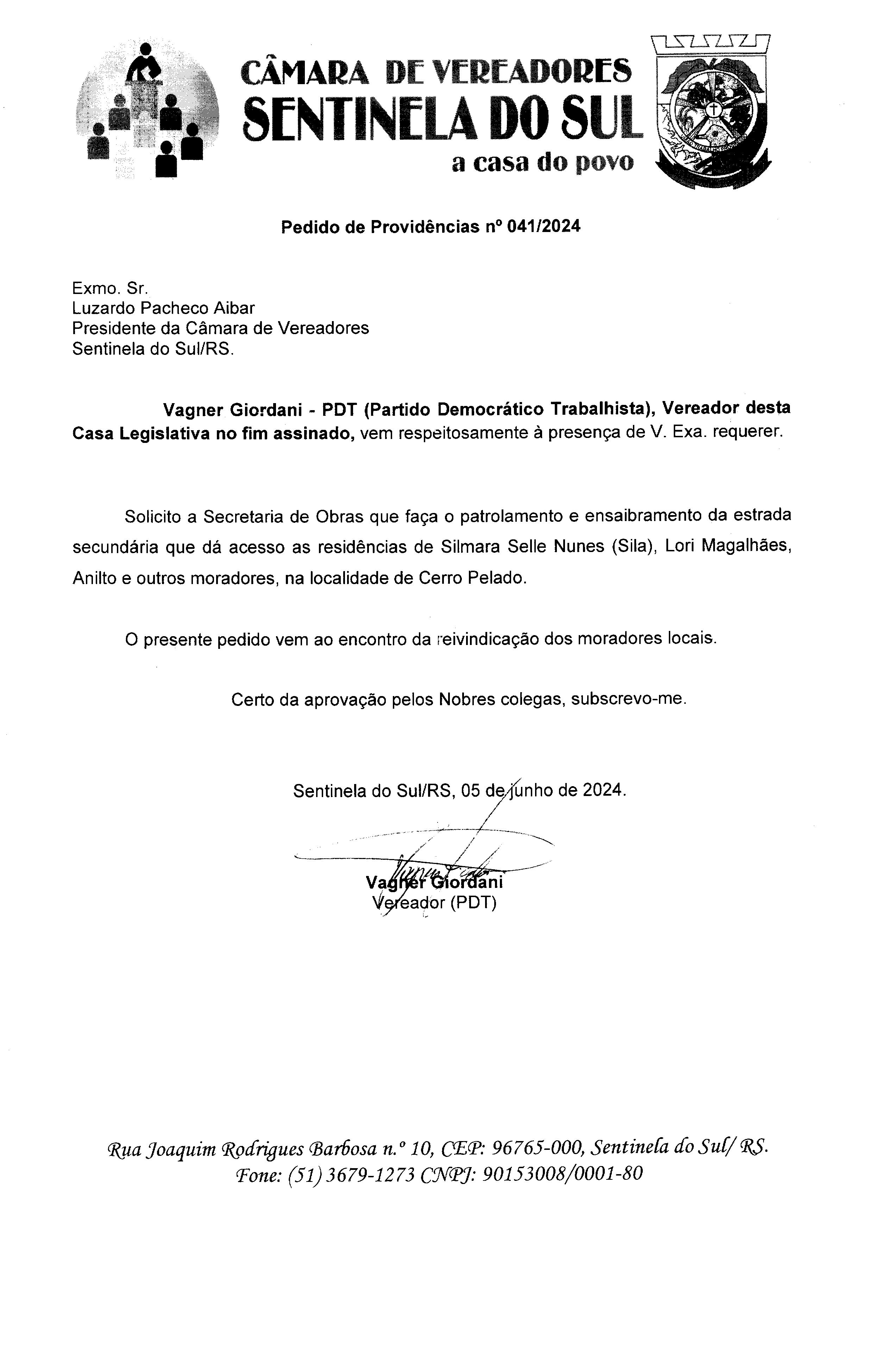 Pedido de Providências de autoria do Vereador Vagner Giordani