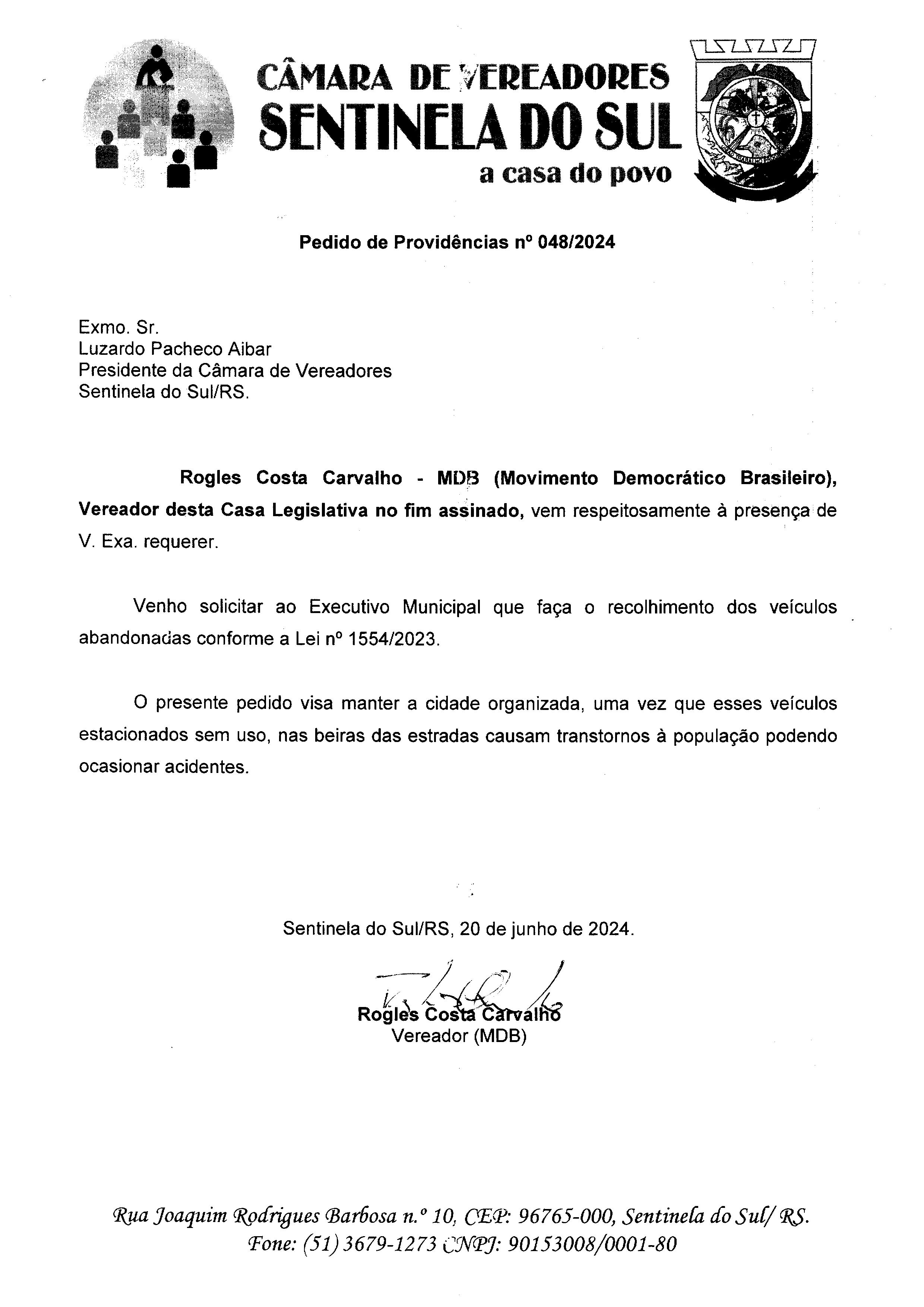 Pedido de Providências de autoria do Vereador Rogles Costa Carvalho