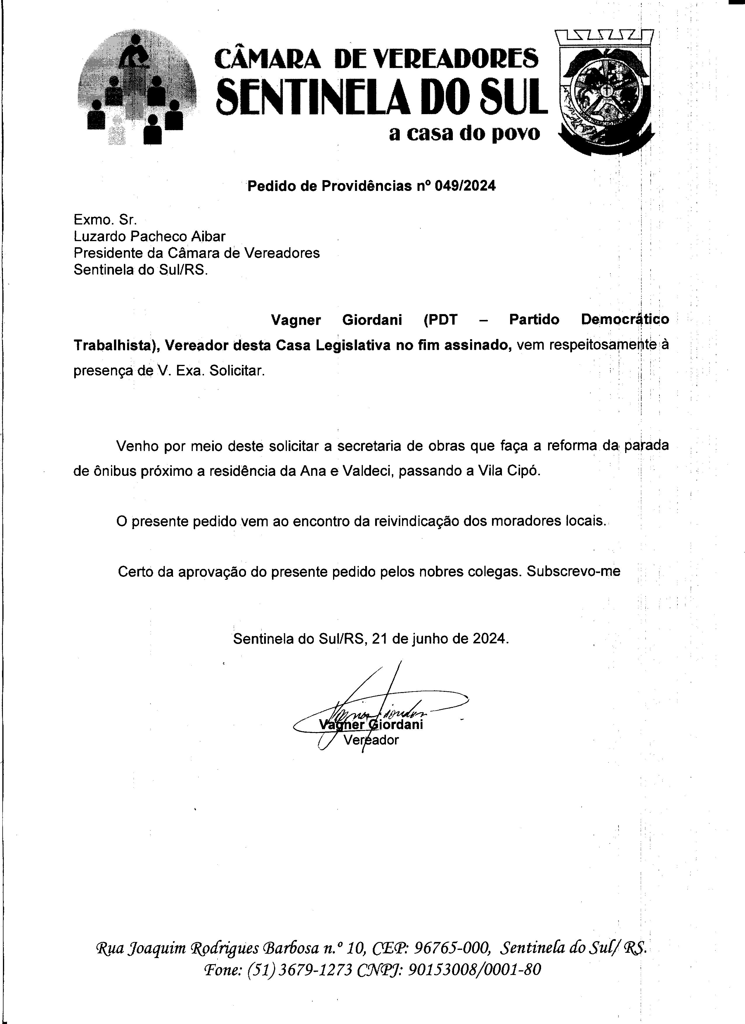 Pedido de Providências de autoria do Vereador Vagner Giordani