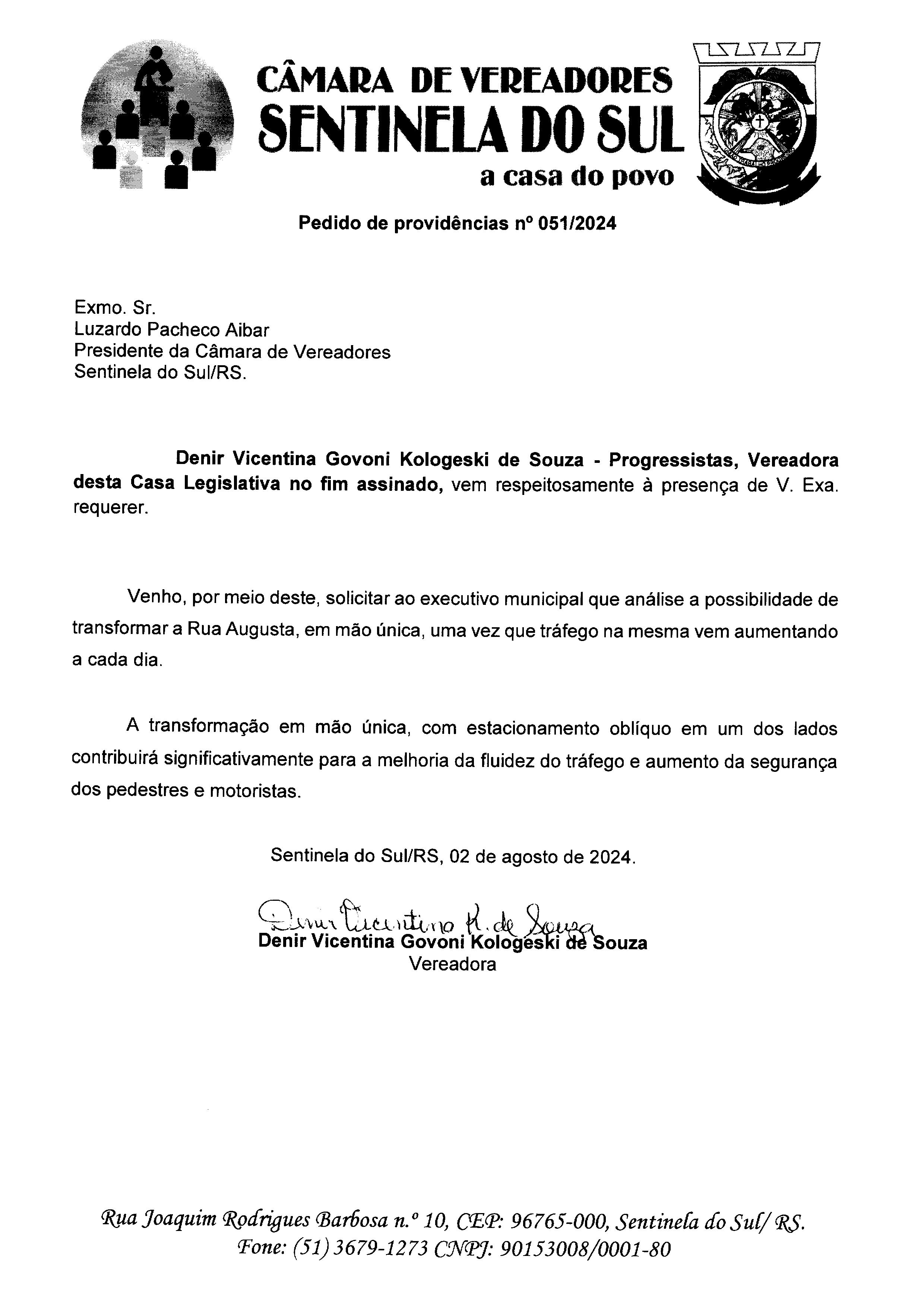 Pedido de Providências de autoria da Vereadora Denir Vicentina Govoni Kologeski de Souza