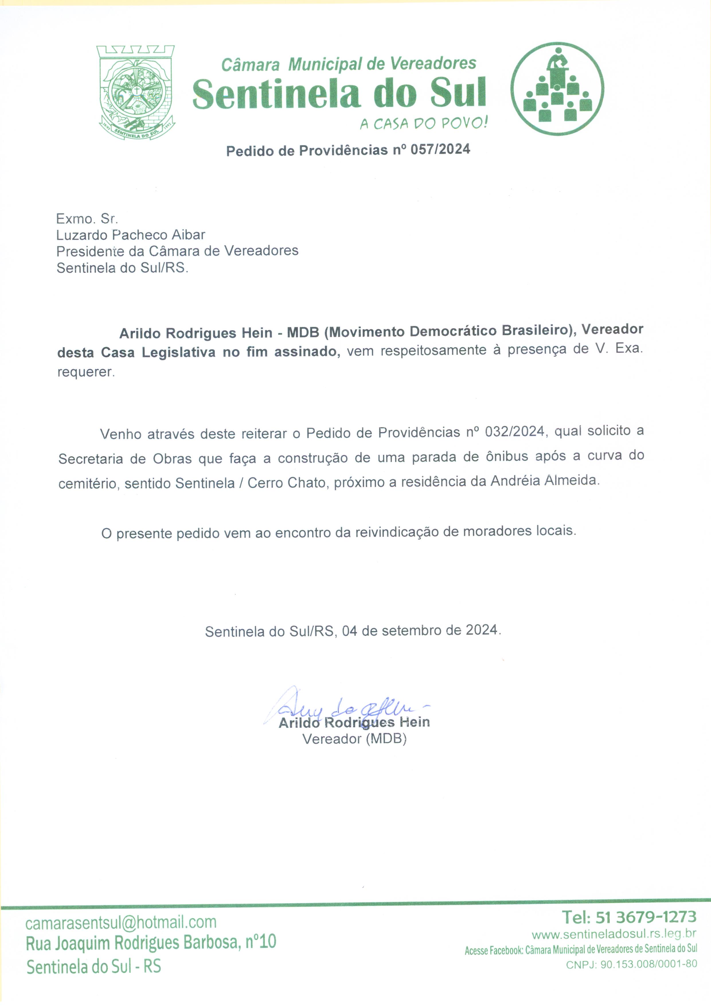 Pedido de Providências de autoria do Vereador Arildo Rodrigues Hein