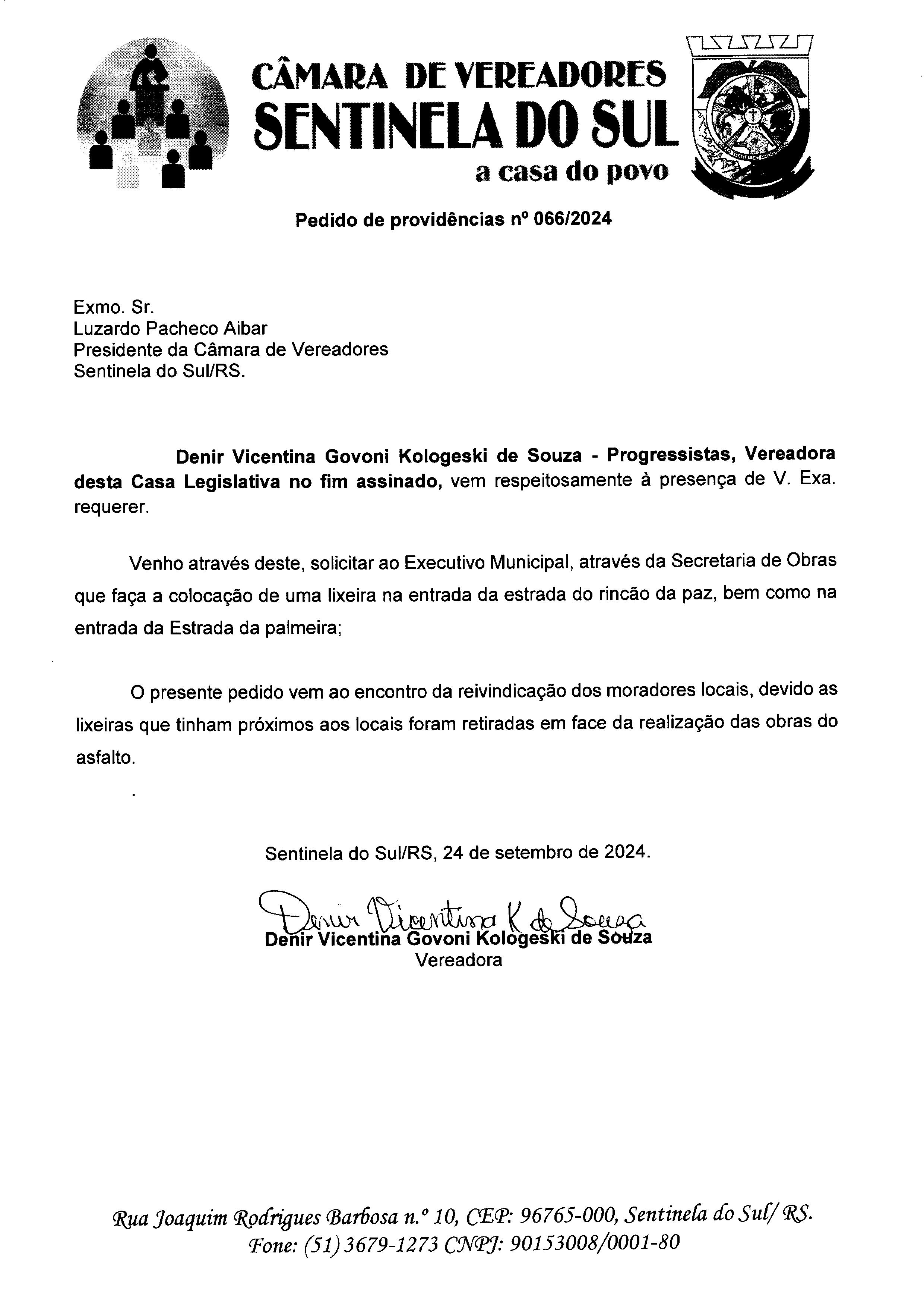 Pedido de Providências de autoria da Vereadora Denir Vicentina Govoni Kologeski de Souza
