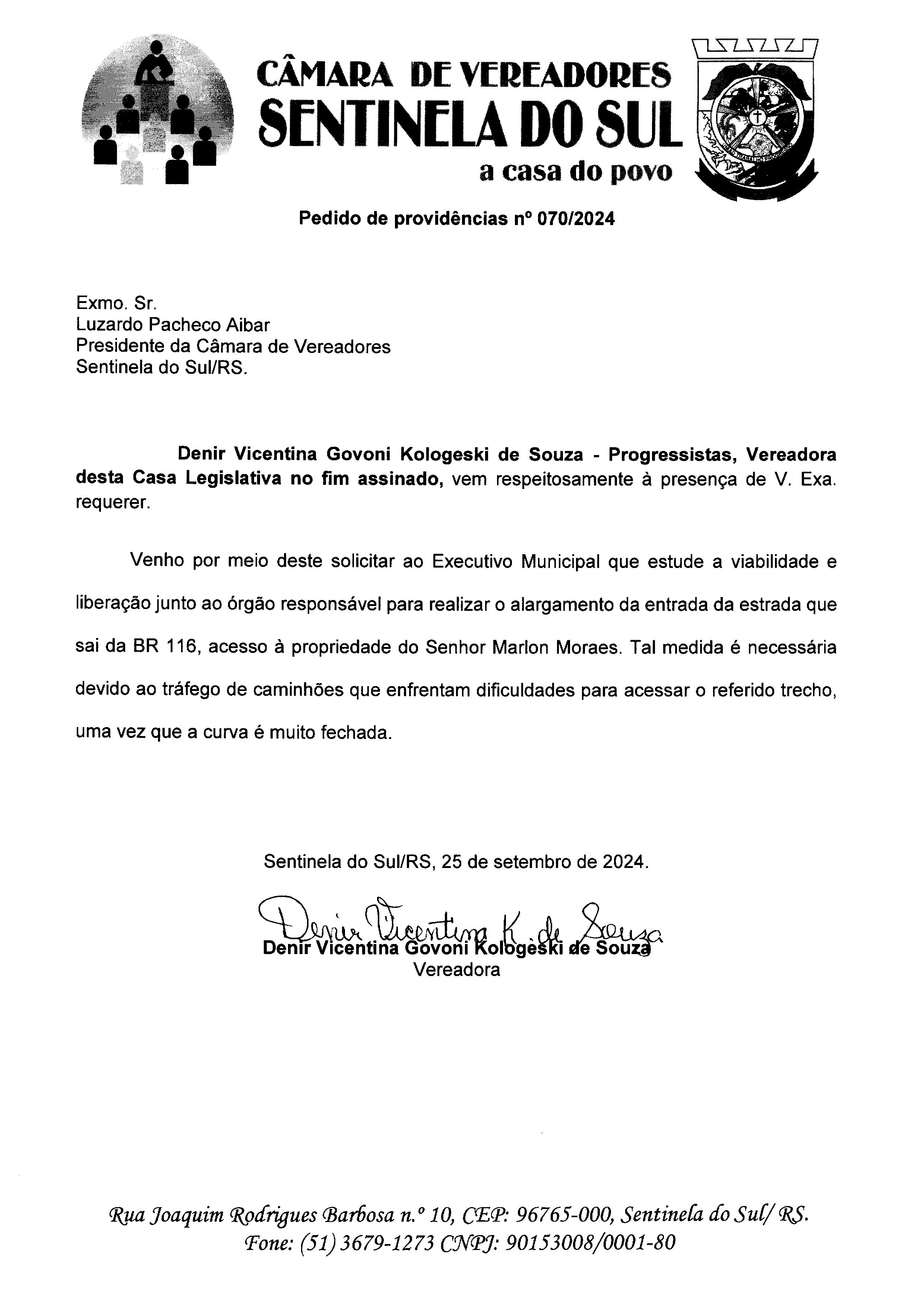 Pedido de Providências de autoria da Vereadora Denir Vicentina Govoni Kologeski de Souza