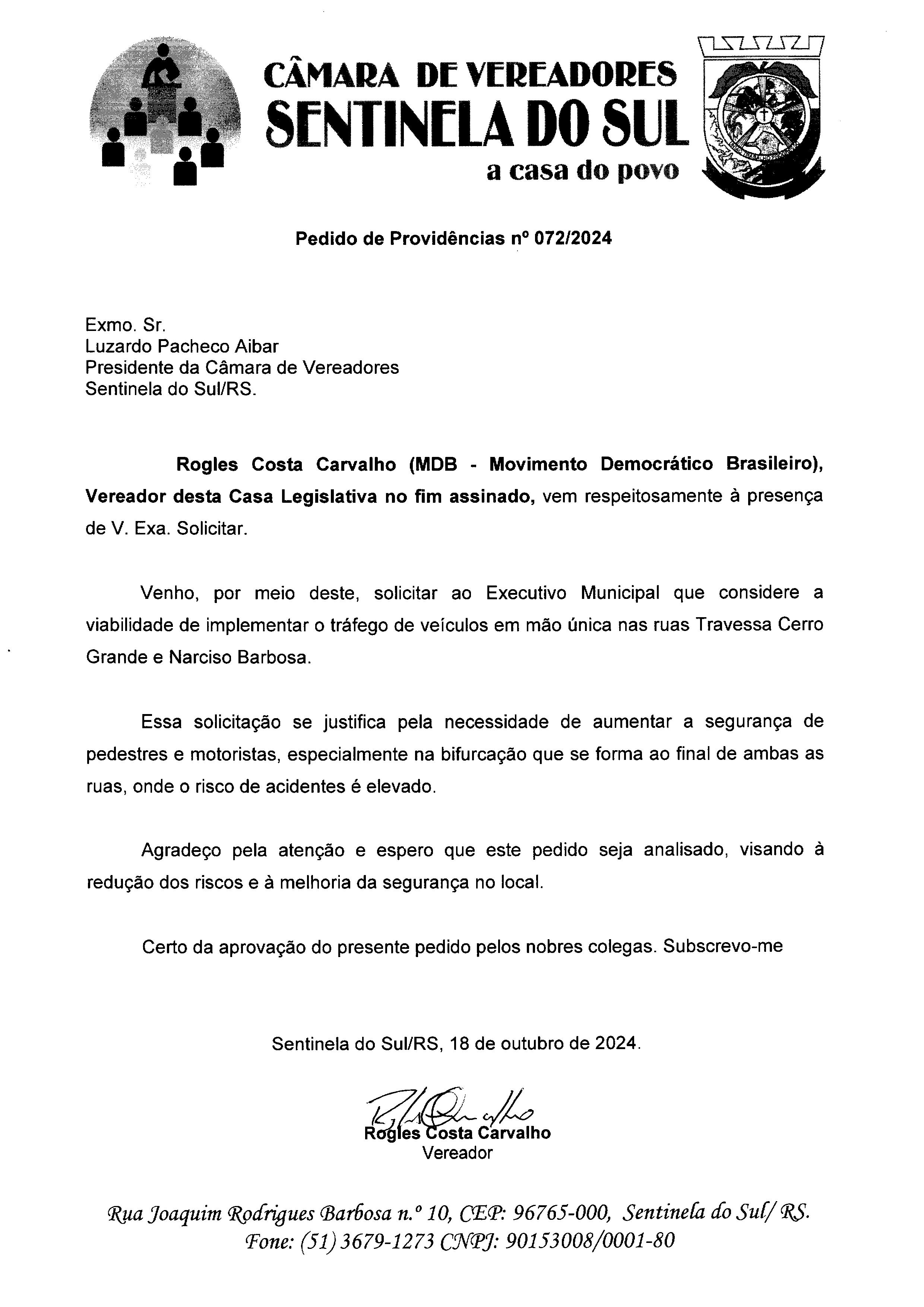 Pedido de Providências de autoria do Vereador Rogles Costa Carvalho