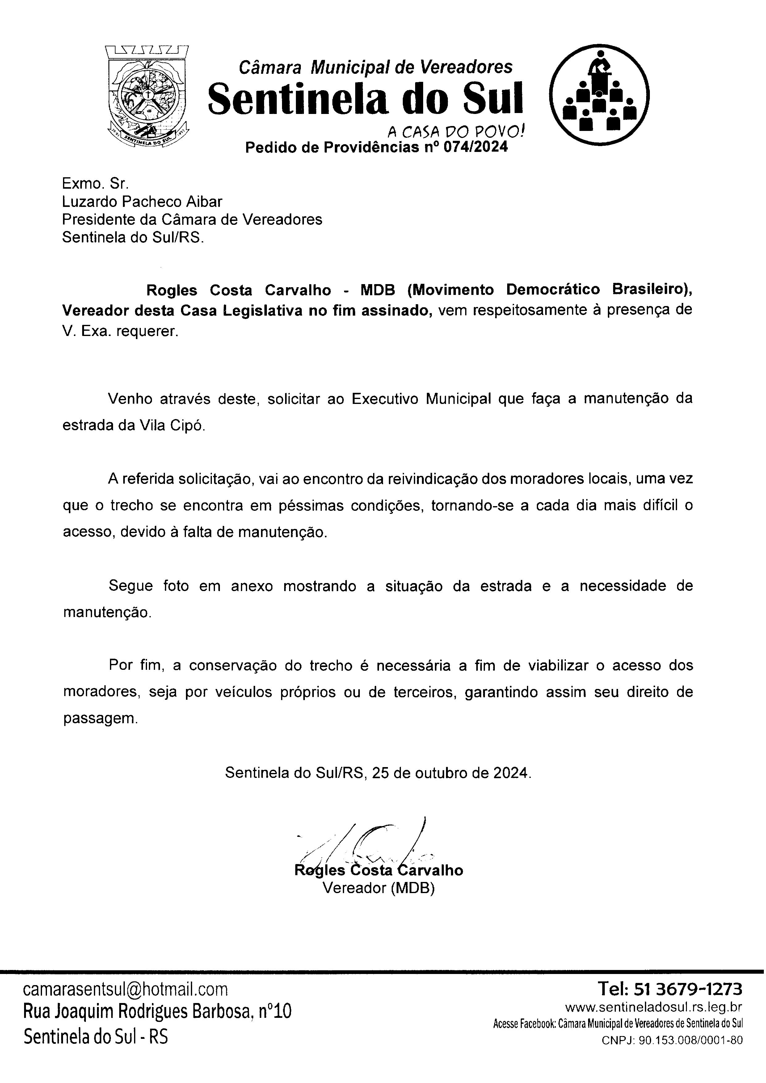 Pedido de Providências de autoria do Vereador Rogles Costa Carvalho