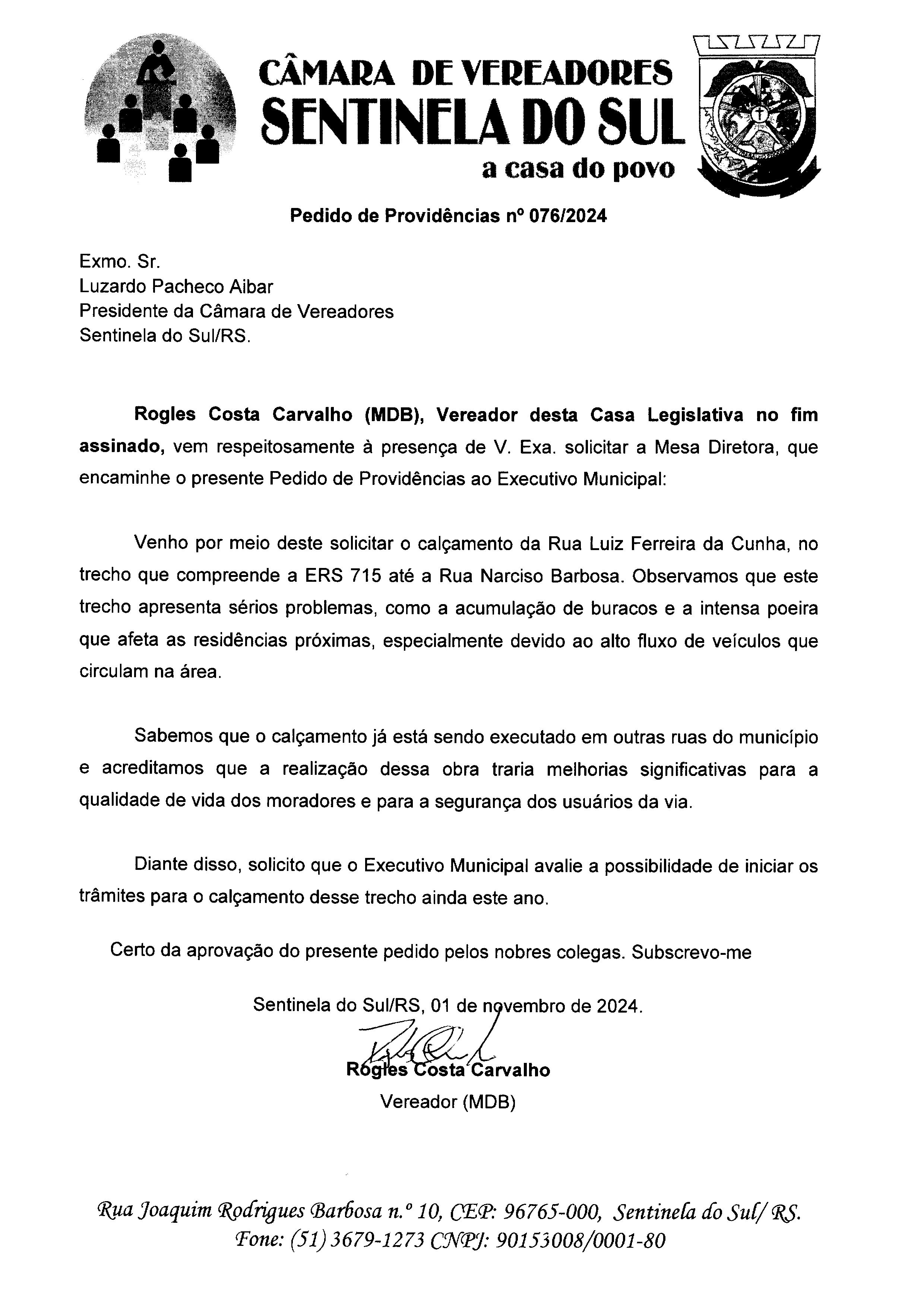 Pedido de Providências de autoria do Vereador Rogles Costa Carvalho