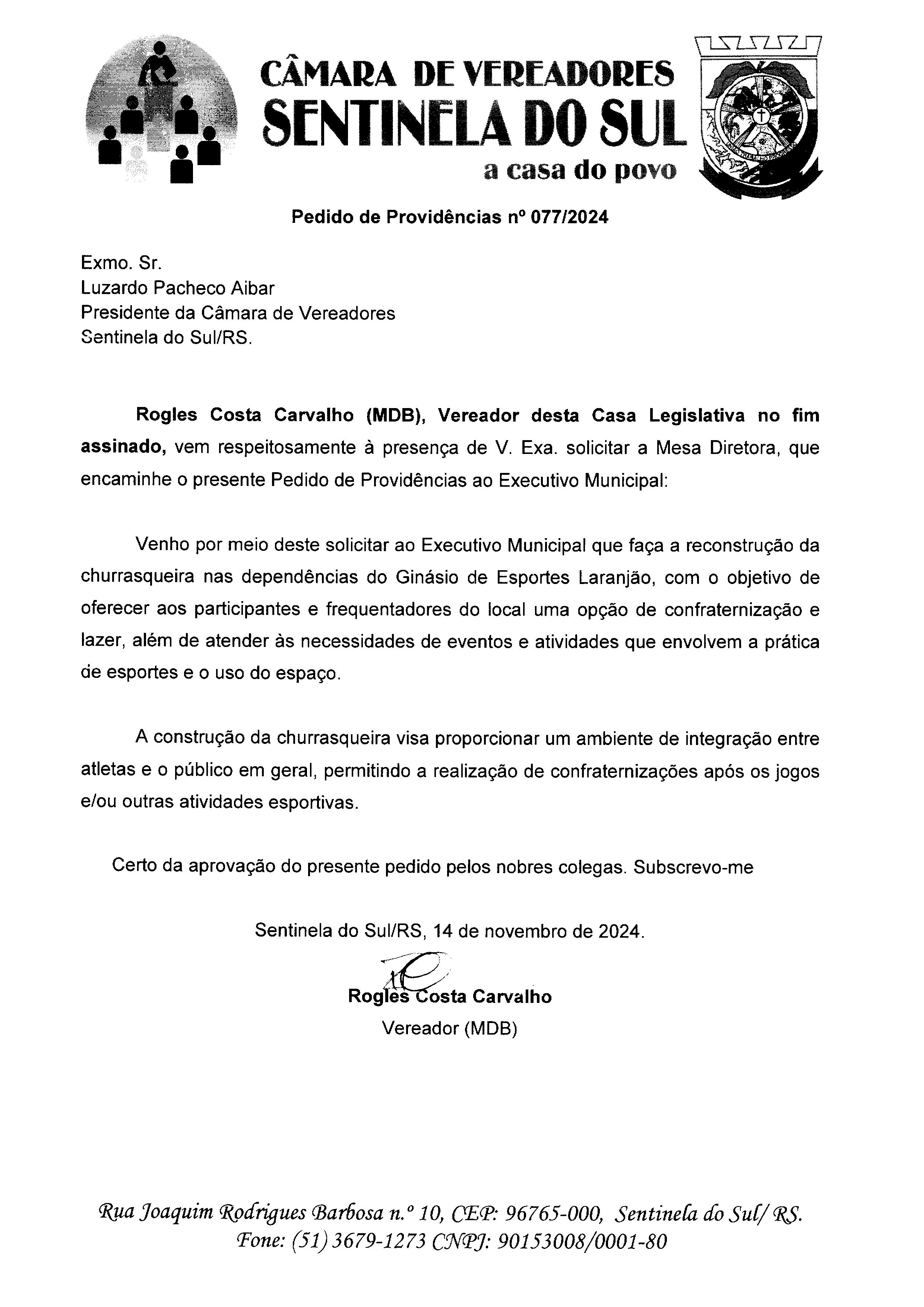 Pedido de Providências de autoria do Vereador Rogles Costa Carvalho