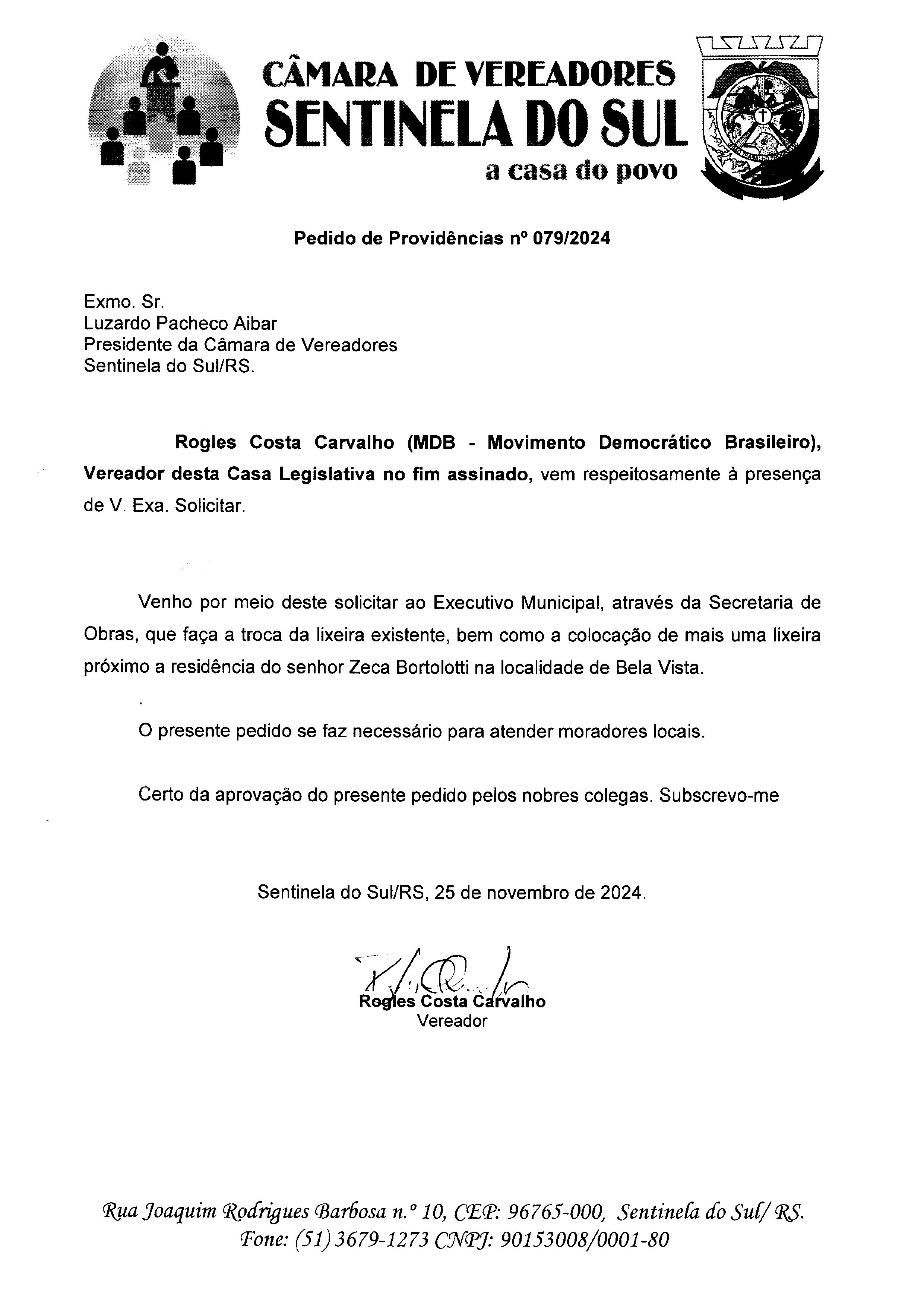 Pedido de Providências de autoria do Vereador Rogles Costa Carvalho