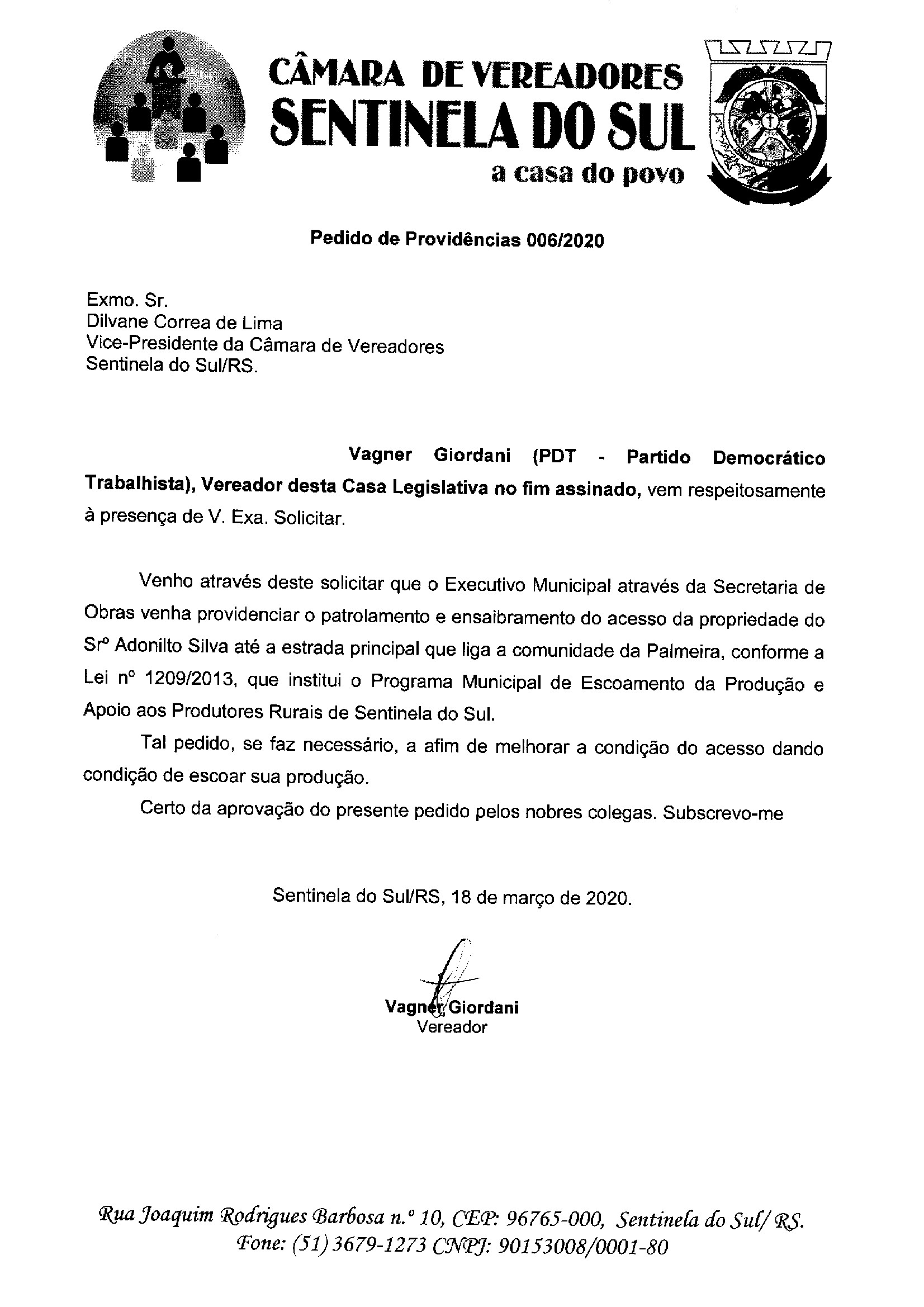PEDIDO DE PROVIDÊNCIAS Nº 006/2020