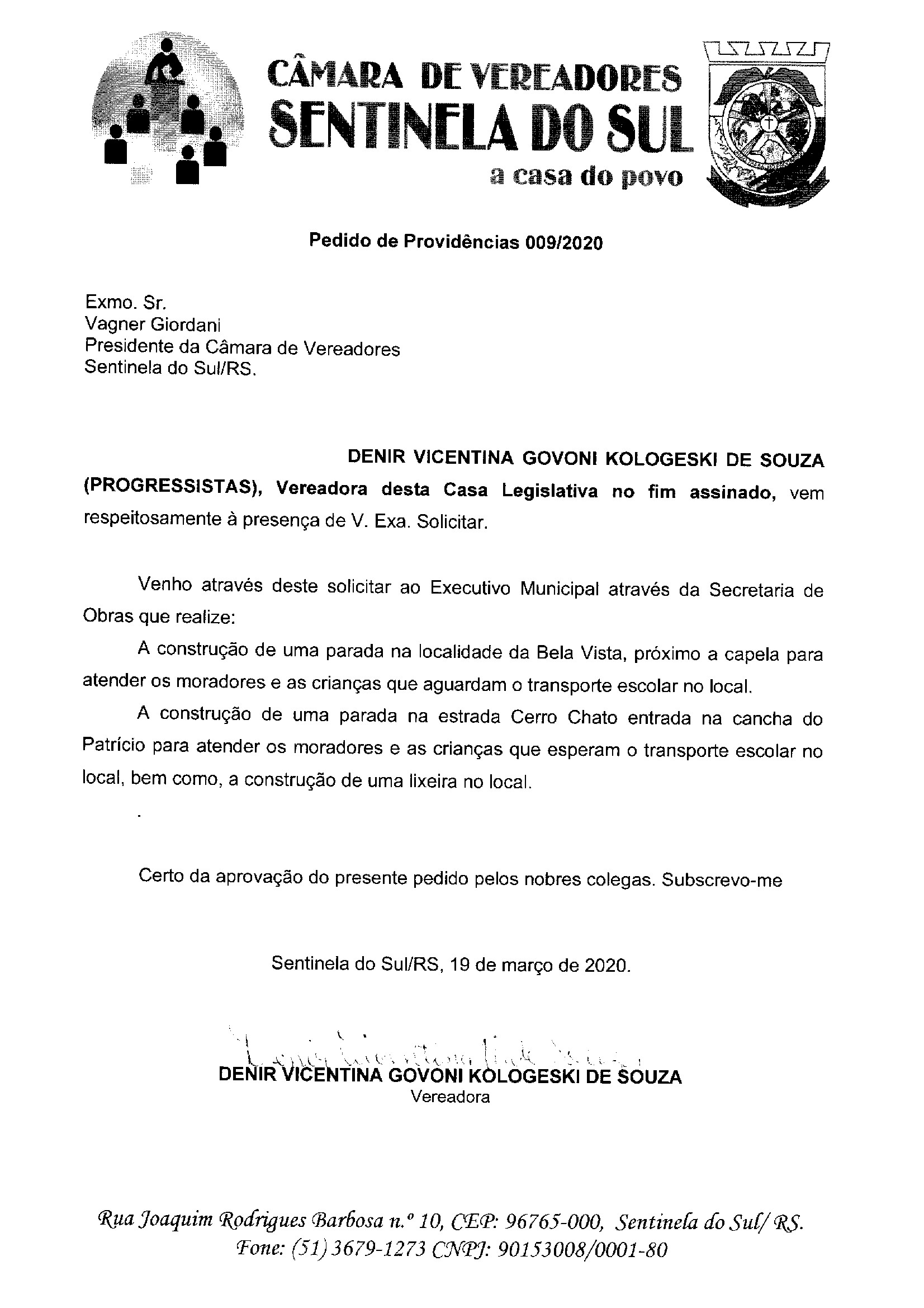 Pedido de Providências de autoria da Vereadora Denir Vicentina Govoni Kologeski de Souza