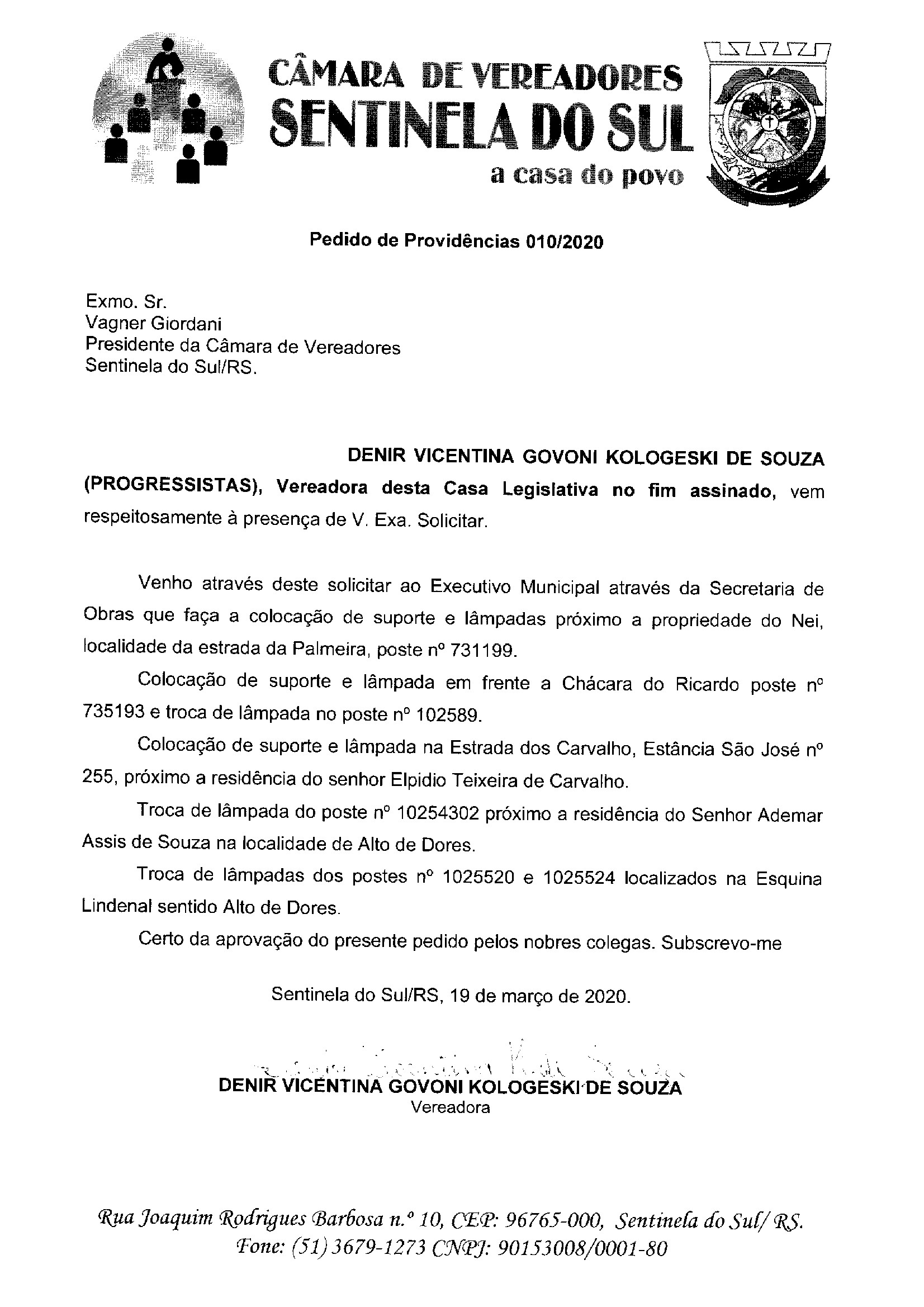Pedido de Providências de autoria da Vereadora Denir Vicentina Govoni Kologeski de Souza