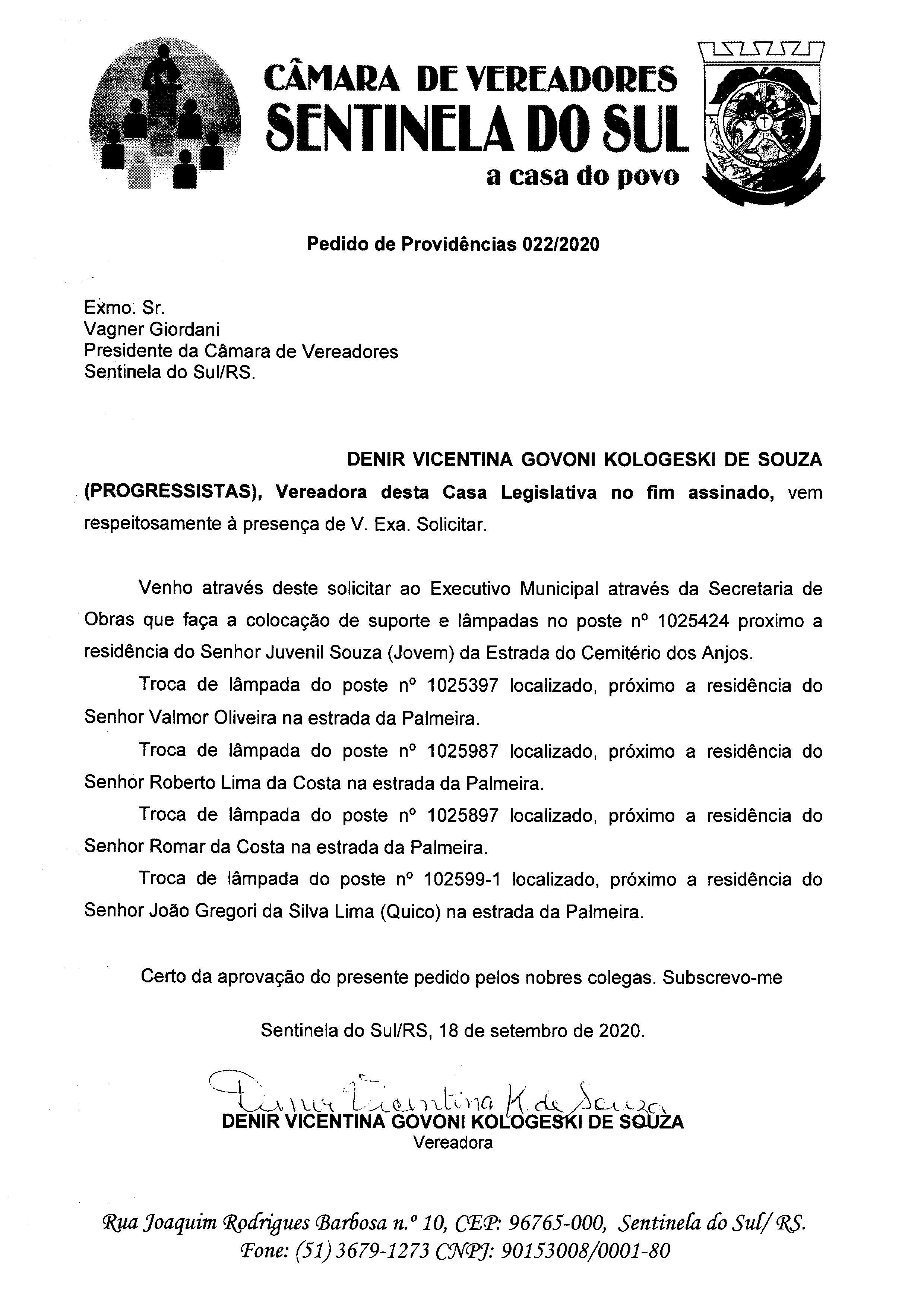 Pedido de Providências de autoria da Vereadora Denir Vicentina Govoni Kologeski de Souza