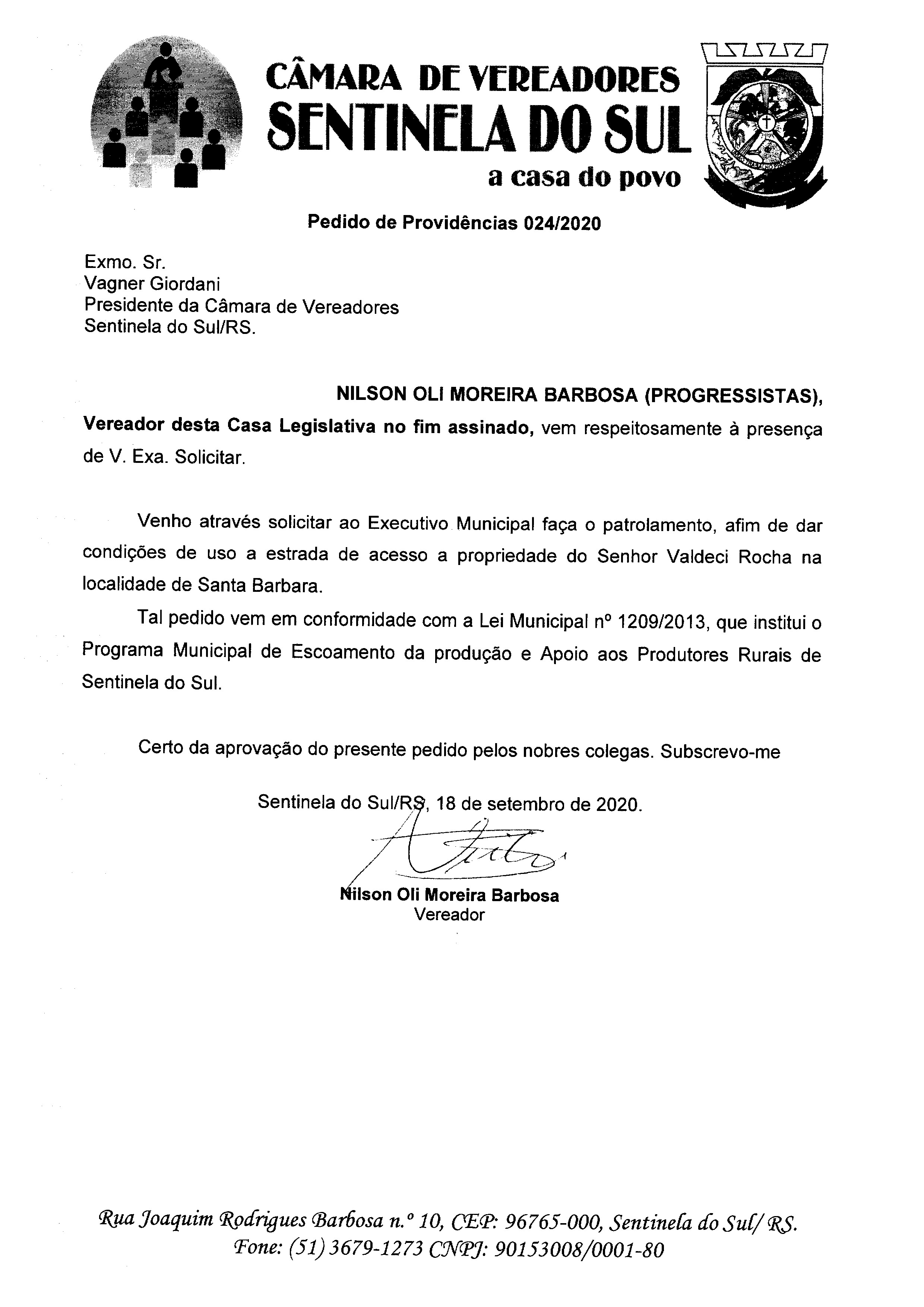 Pedido de Providências de autoria do Vereador Nilson Oli Moreira Barbosa