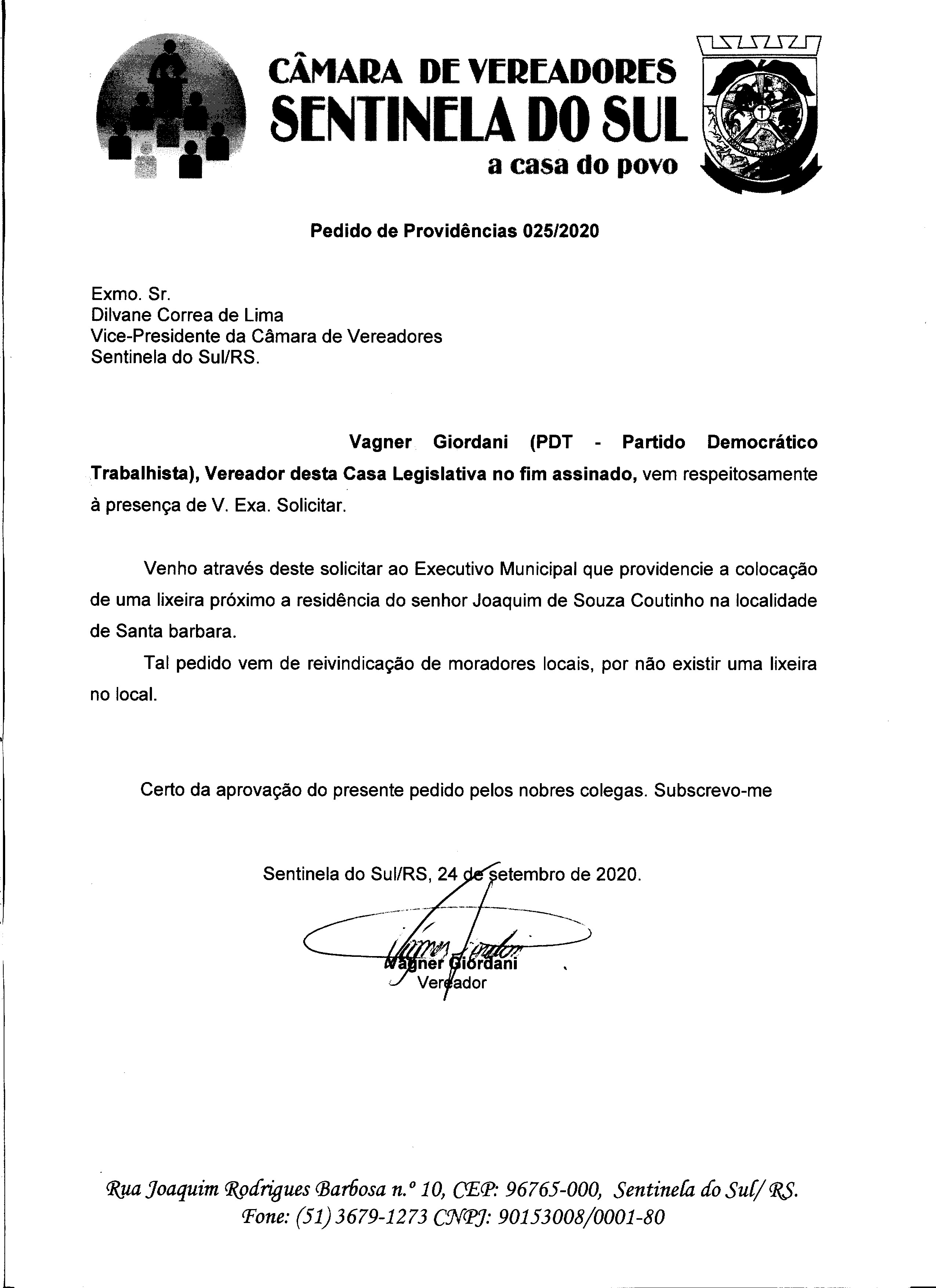 PEDIDO DE PROVIDÊNCIAS nº 025/2020
