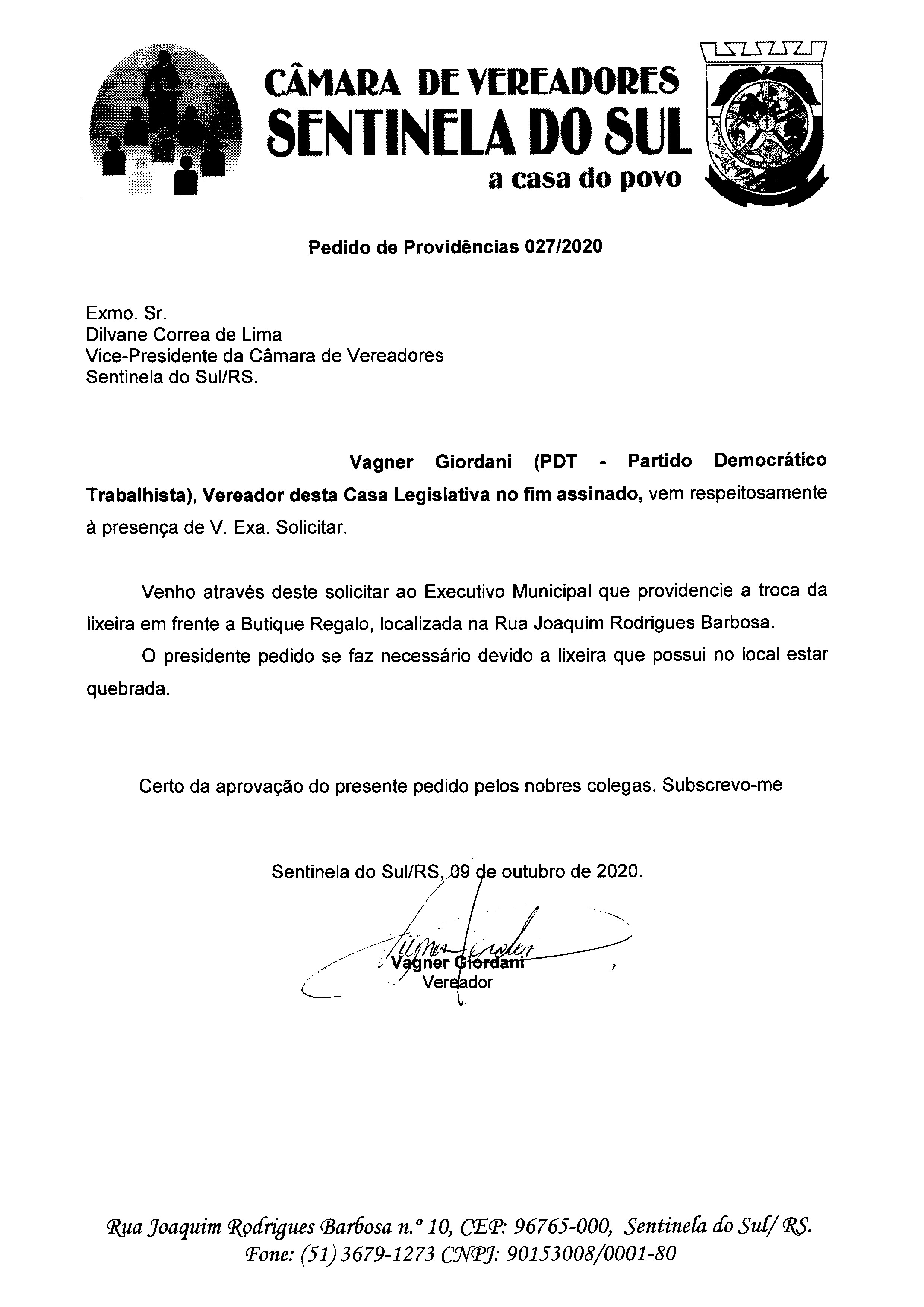 Pedido de Providências de autoria do Vereador Vagner Giordani