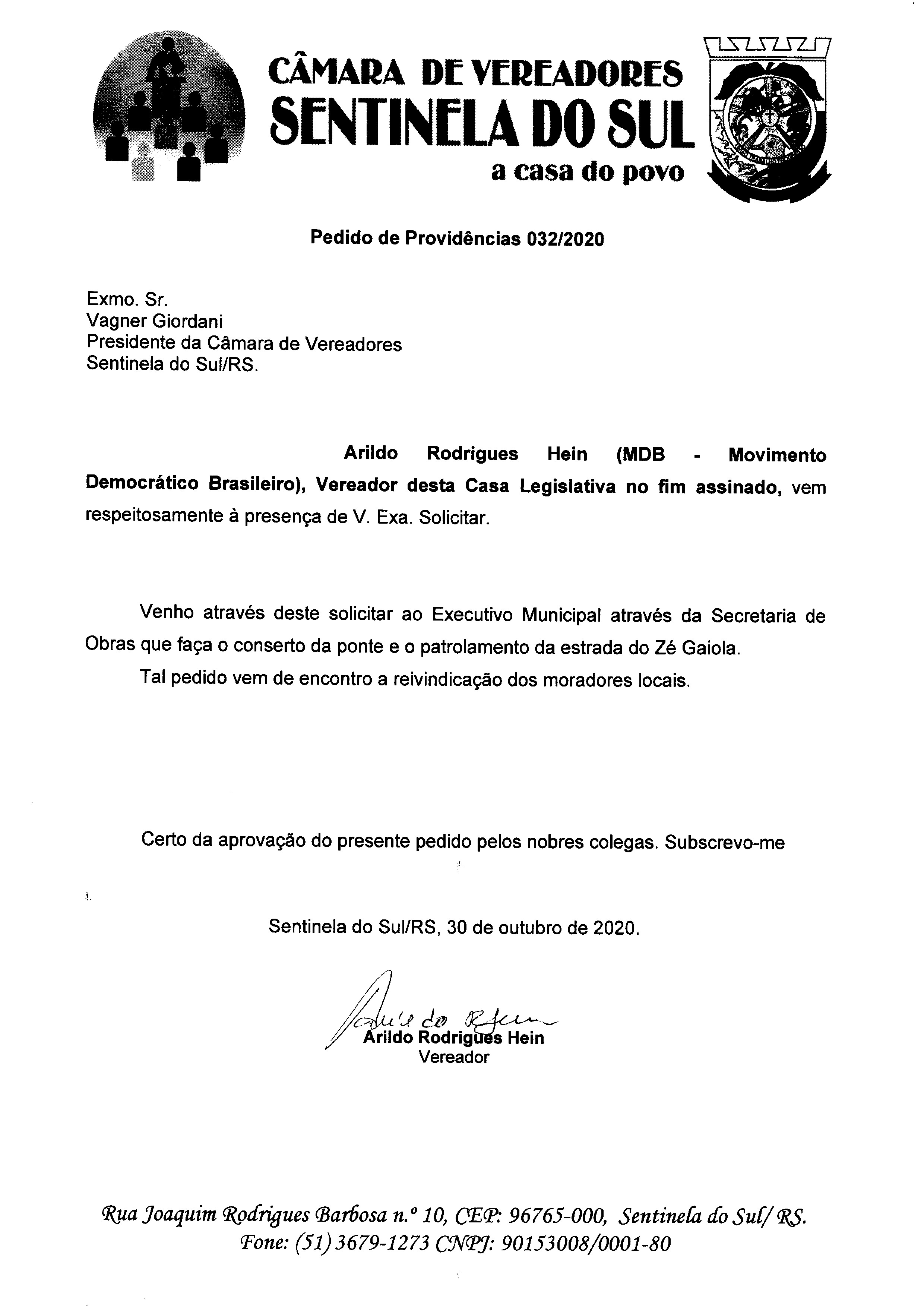 Pedido de Providências nº 032/2020 de autoria do vereador Arildo Rodrigues Hein
