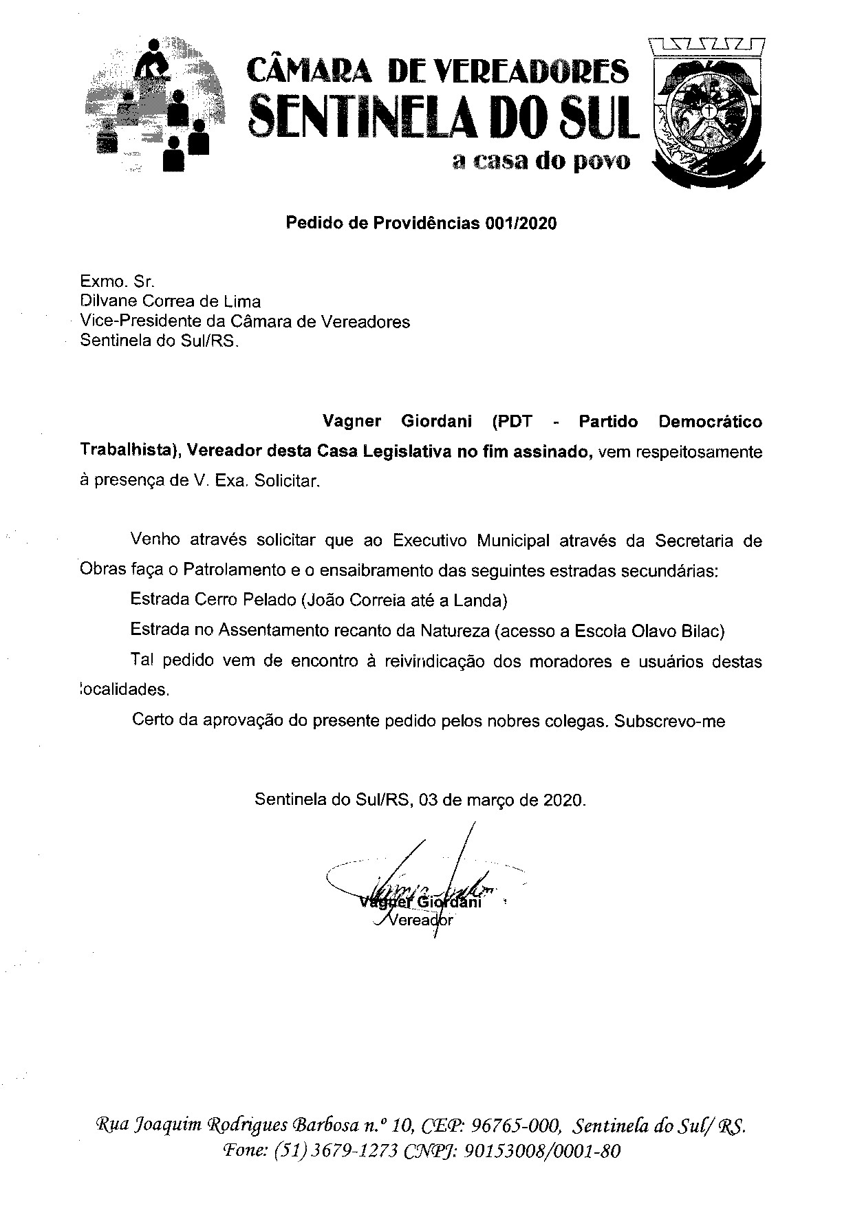 Pedido de Providências de autoria do Vereador Vagner Giordani