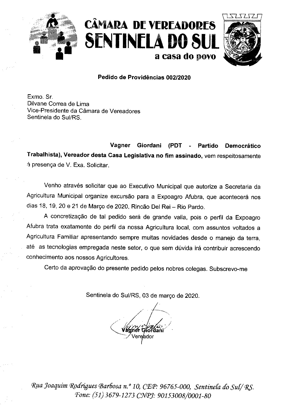 PEDIDO DO PROVIDÊNCIAS nº 002/2020