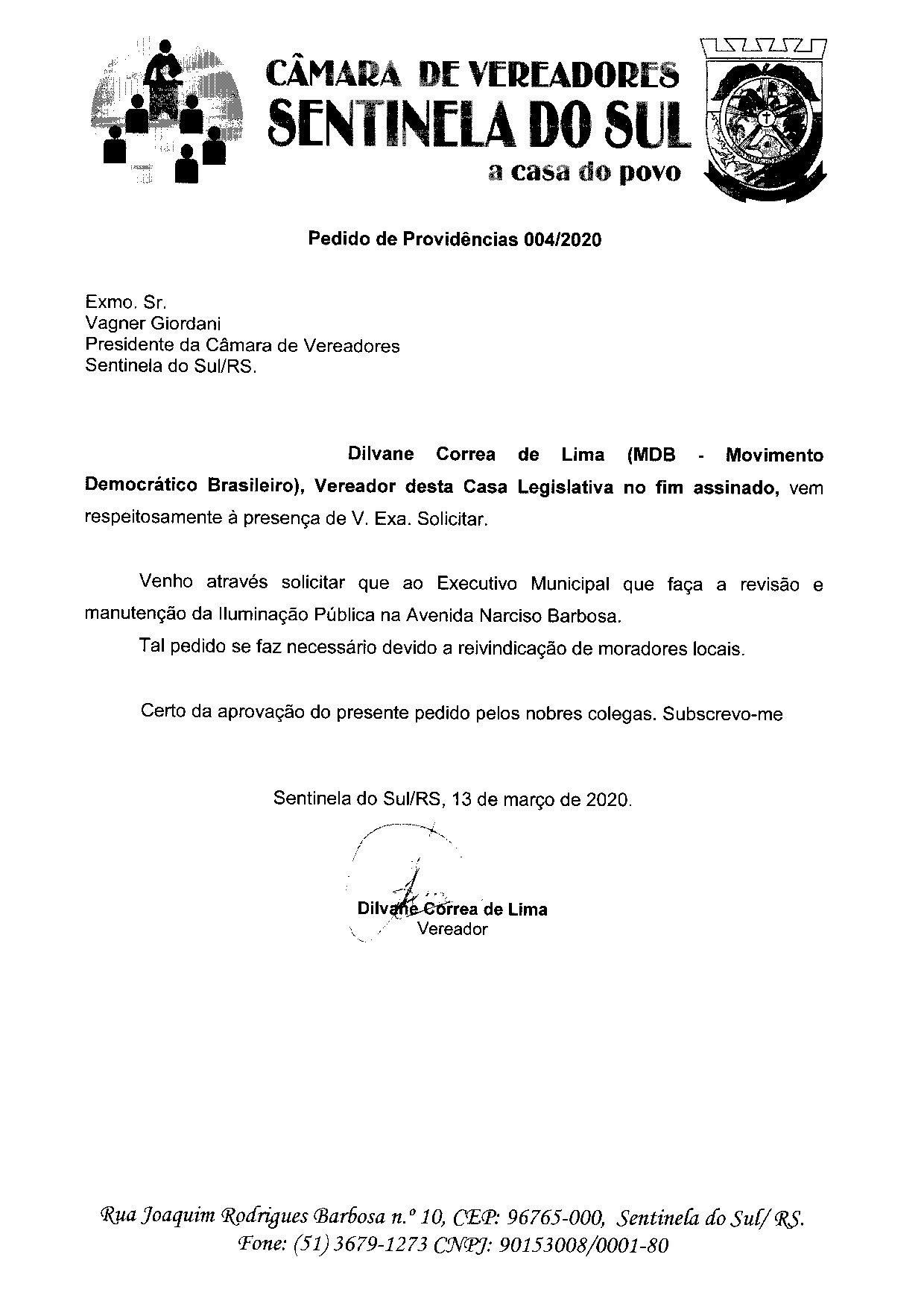 Pedido de Providências de autoria do Vereador Dilvane Correa de Lima