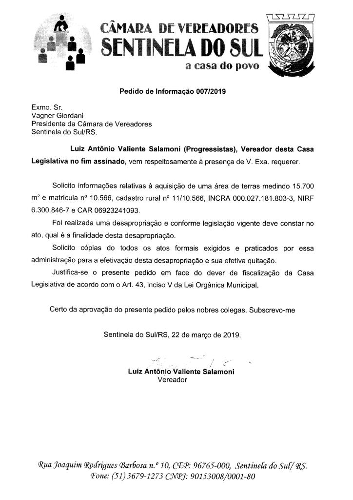 PEDIDO DE INFORMAÇÃO DE AUTORIA DO VEREADOR LUIZ ANTÔNIO VALIENTE SALAMONI