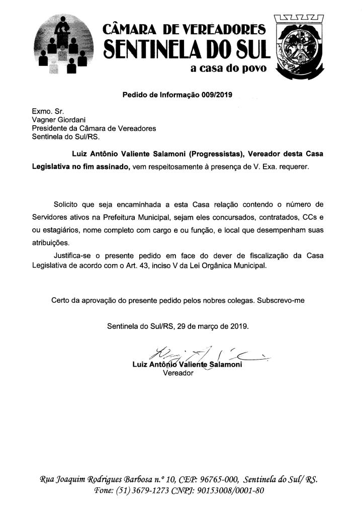 PEDIDO DE INFORMAÇÃO DE AUTORIA DO VEREADOR LUIZ ANTÔNIO VALIENTE SALAMONI