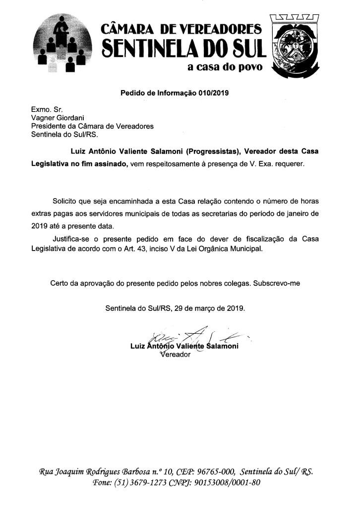 PEDIDO DE INFORMAÇÃO DE AUTORIA DO VEREADOR LUIZ ANTÔNIO VALIENTE SALAMONI