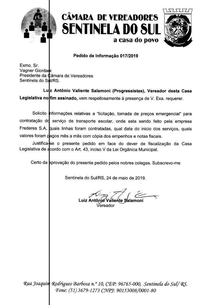 PEDIDO DE INFORMAÇÃO DE AUTORIA DO VEREADOR LUIZ ANTÔNIO VALIENTE SALAMONI