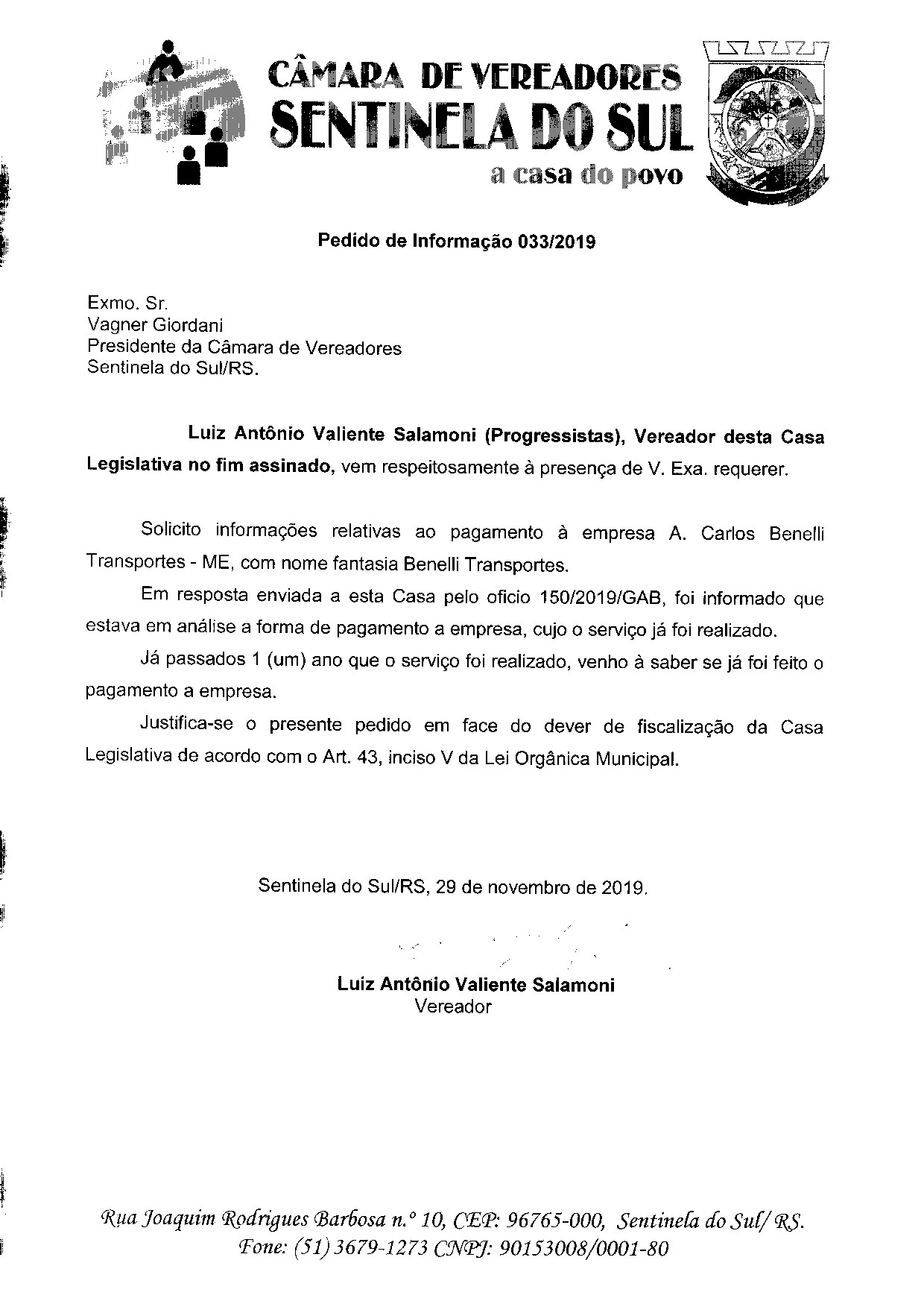 Pedido de Informação de autoria do Vereador Luiz Antônio Valinete Salamoni