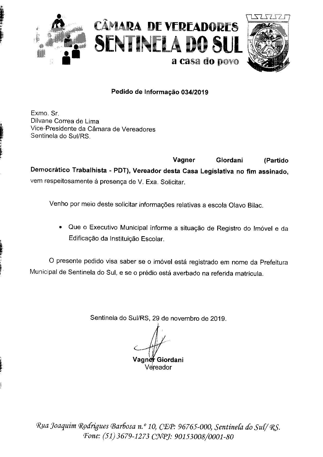 Pedido de Informação de autoria do Vereador Vagner Giordani