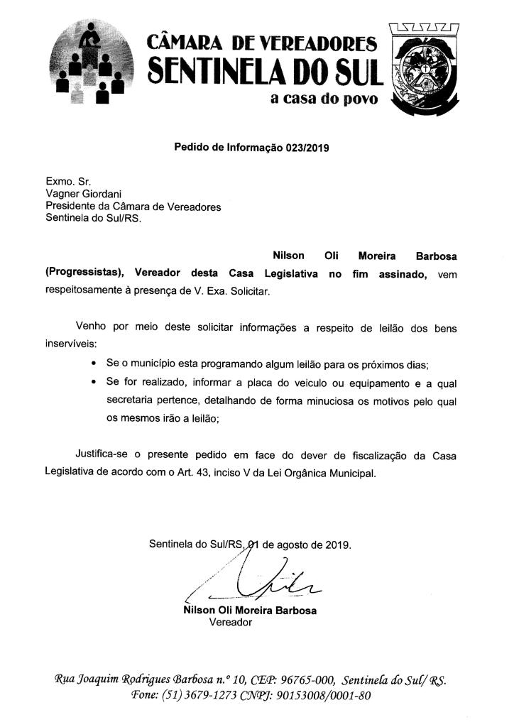 PEDIDO DE INFORMAÇÃO Nº 023/2019