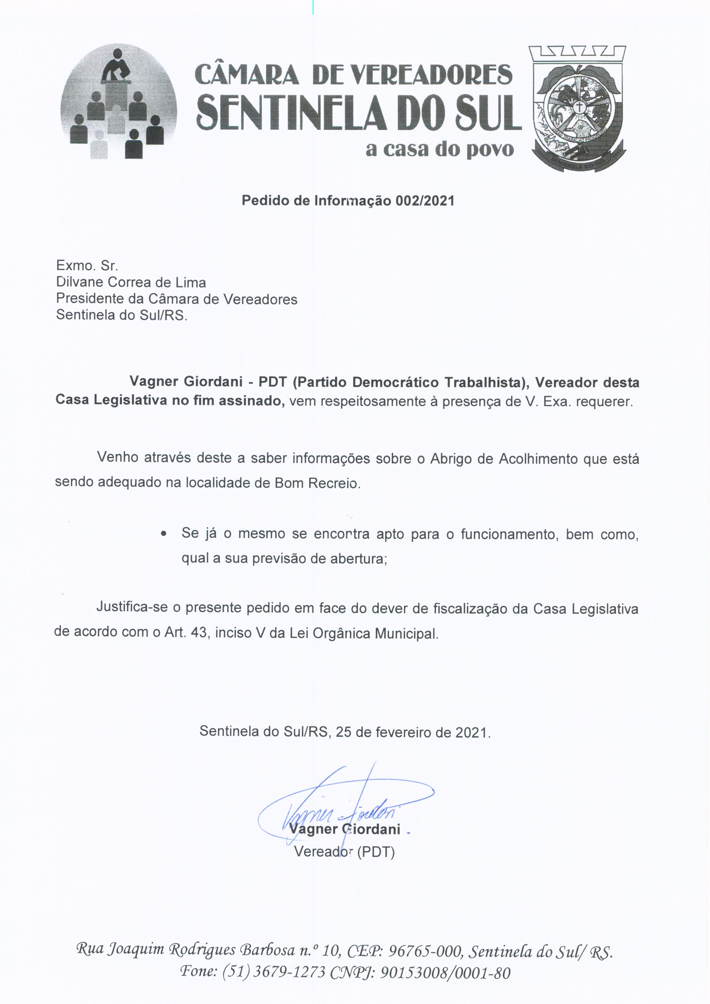 Pedido de Informação de autoria do Vereador Vagner Giordani