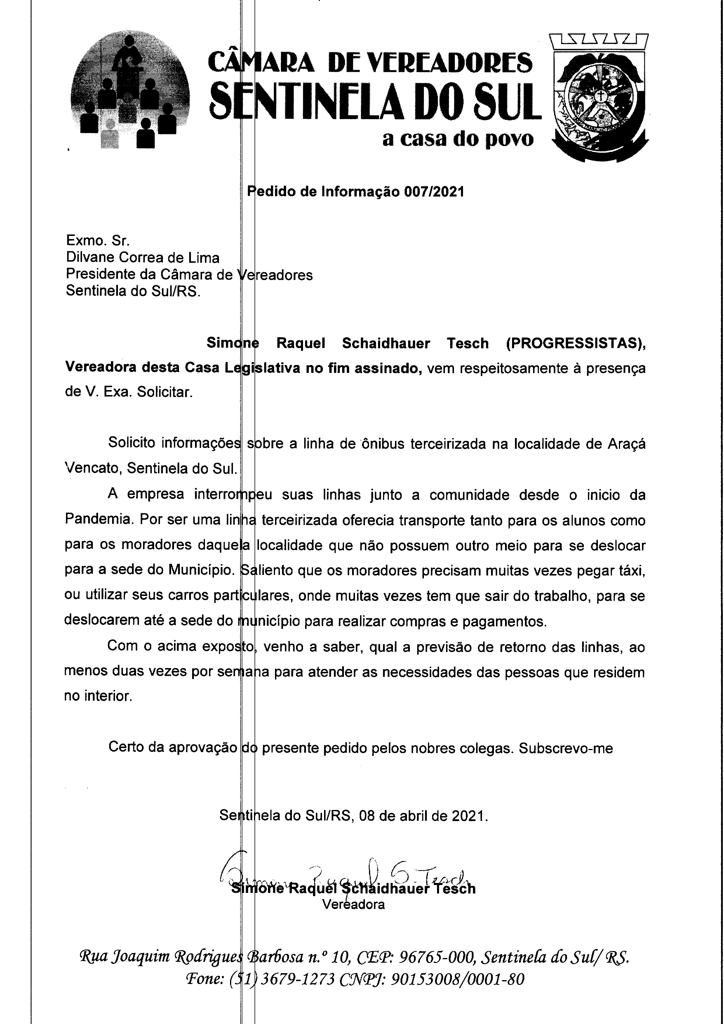 Pedido de Informação da Vereadora Simone Raquel Schaidhauer Tesch