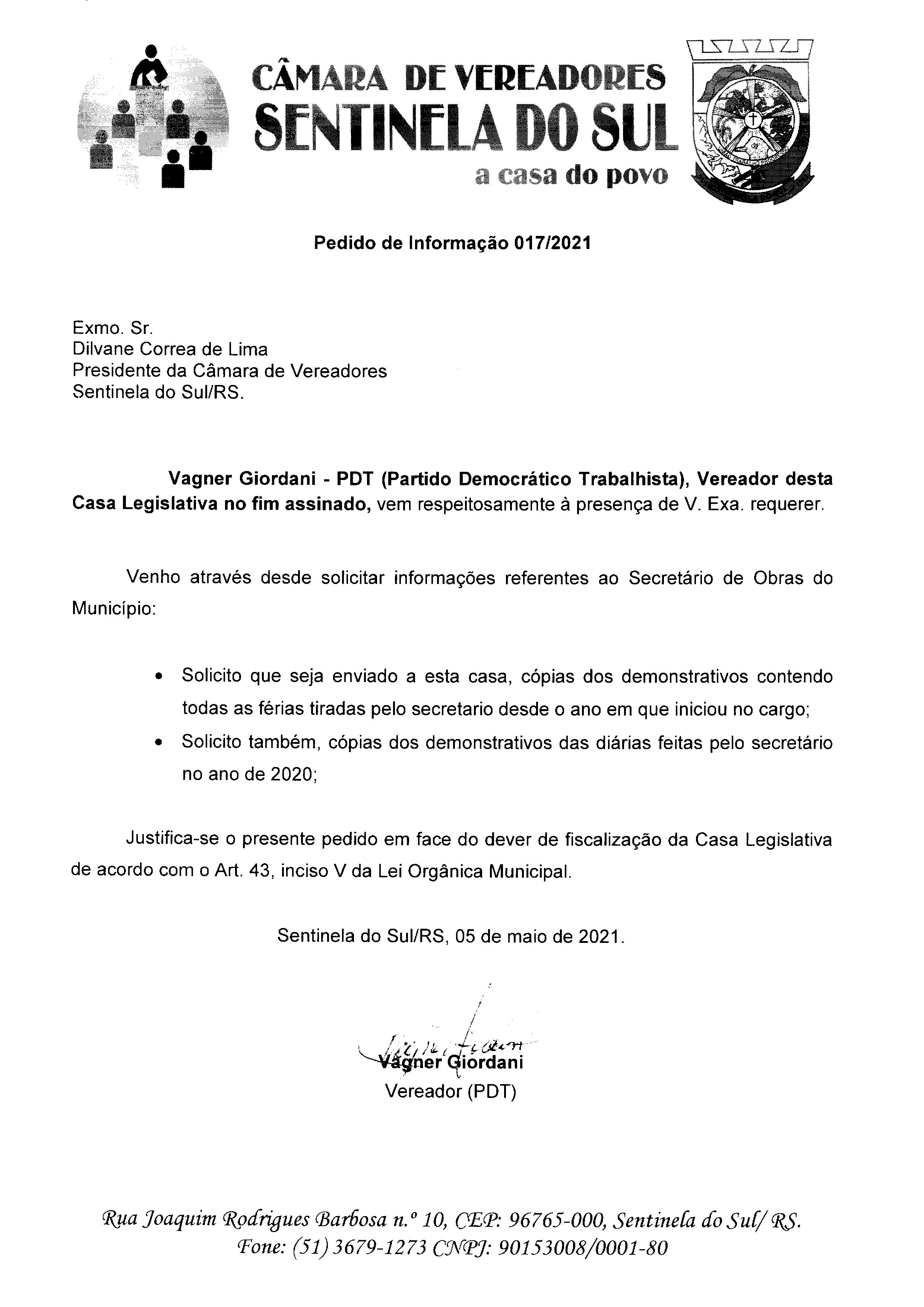 Pedido de Informação de autoria do Vereador Vagner Giordani