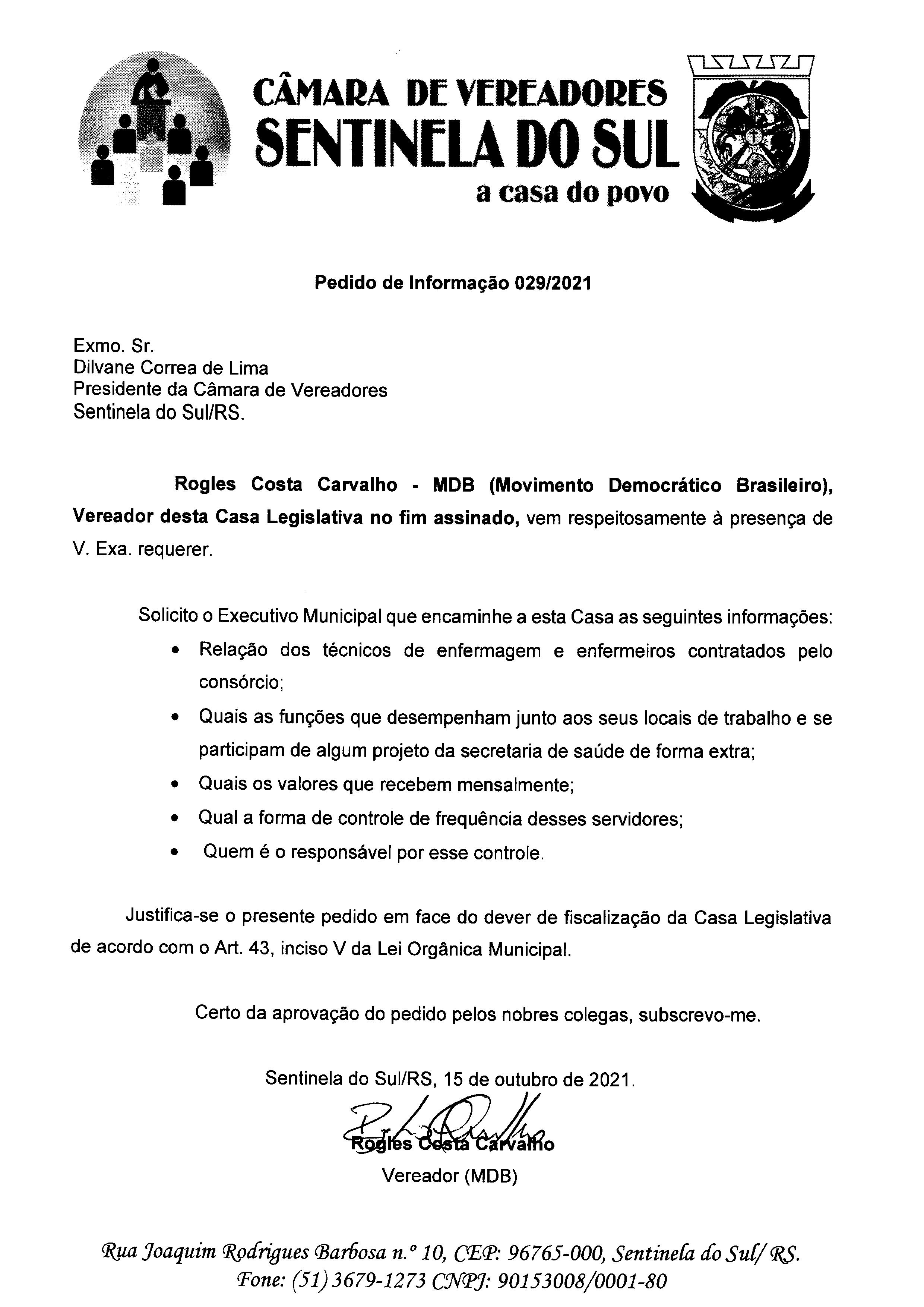 Pedido de Informação de autoria do Vereador Rogles Costa Carvalho