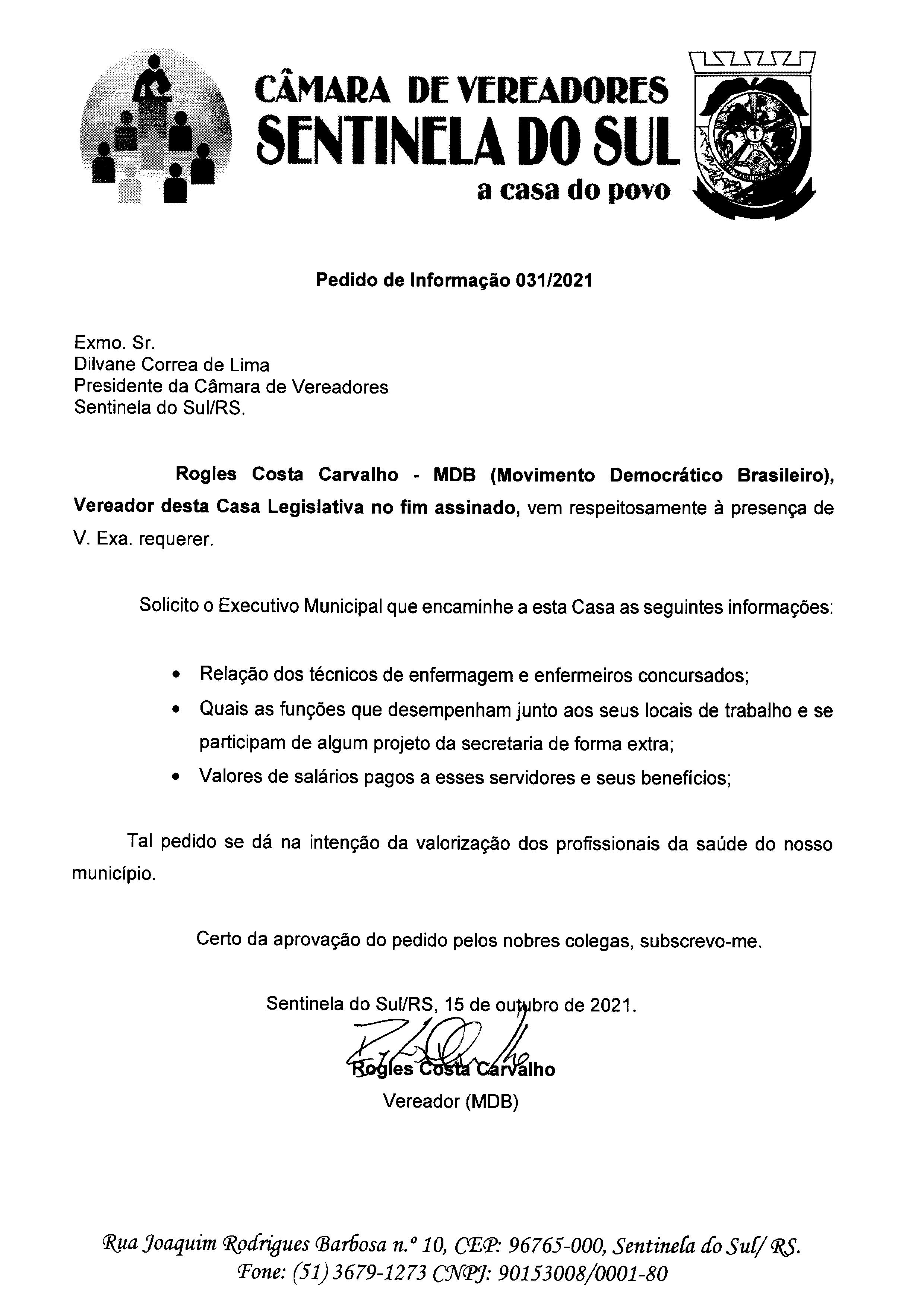 Pedido de Informação de autoria do Vereador Rogles Costa Carvalho