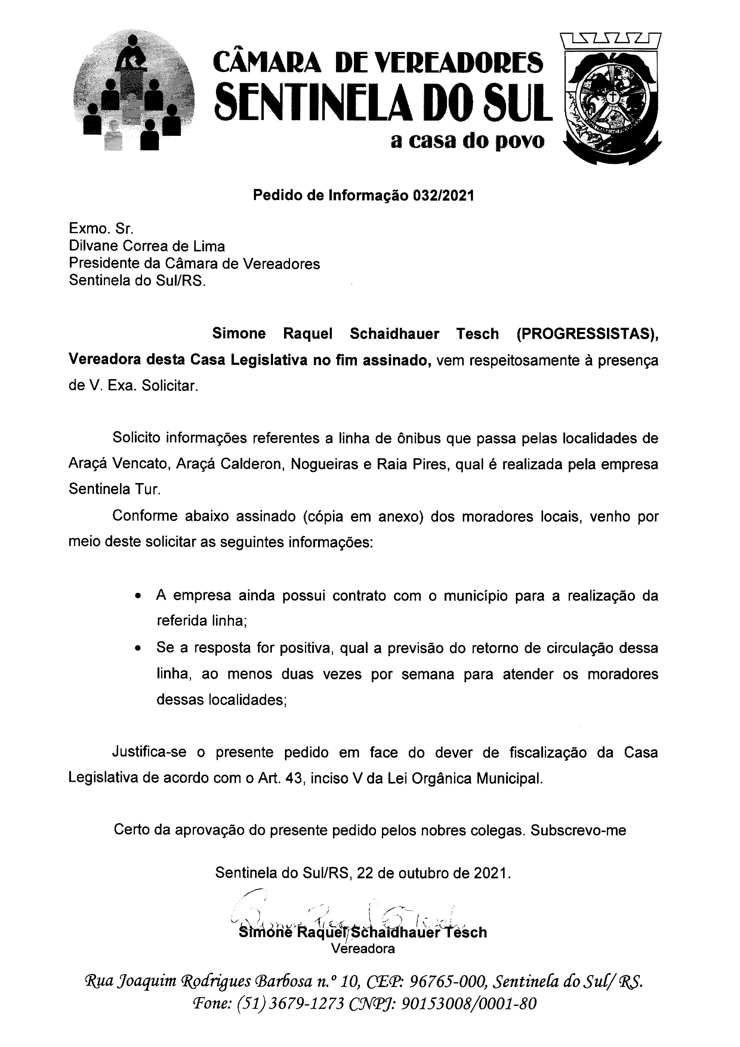 Pedido de Informação de autoria da Vereadora Simone Raquel Schaidhauer Tesch