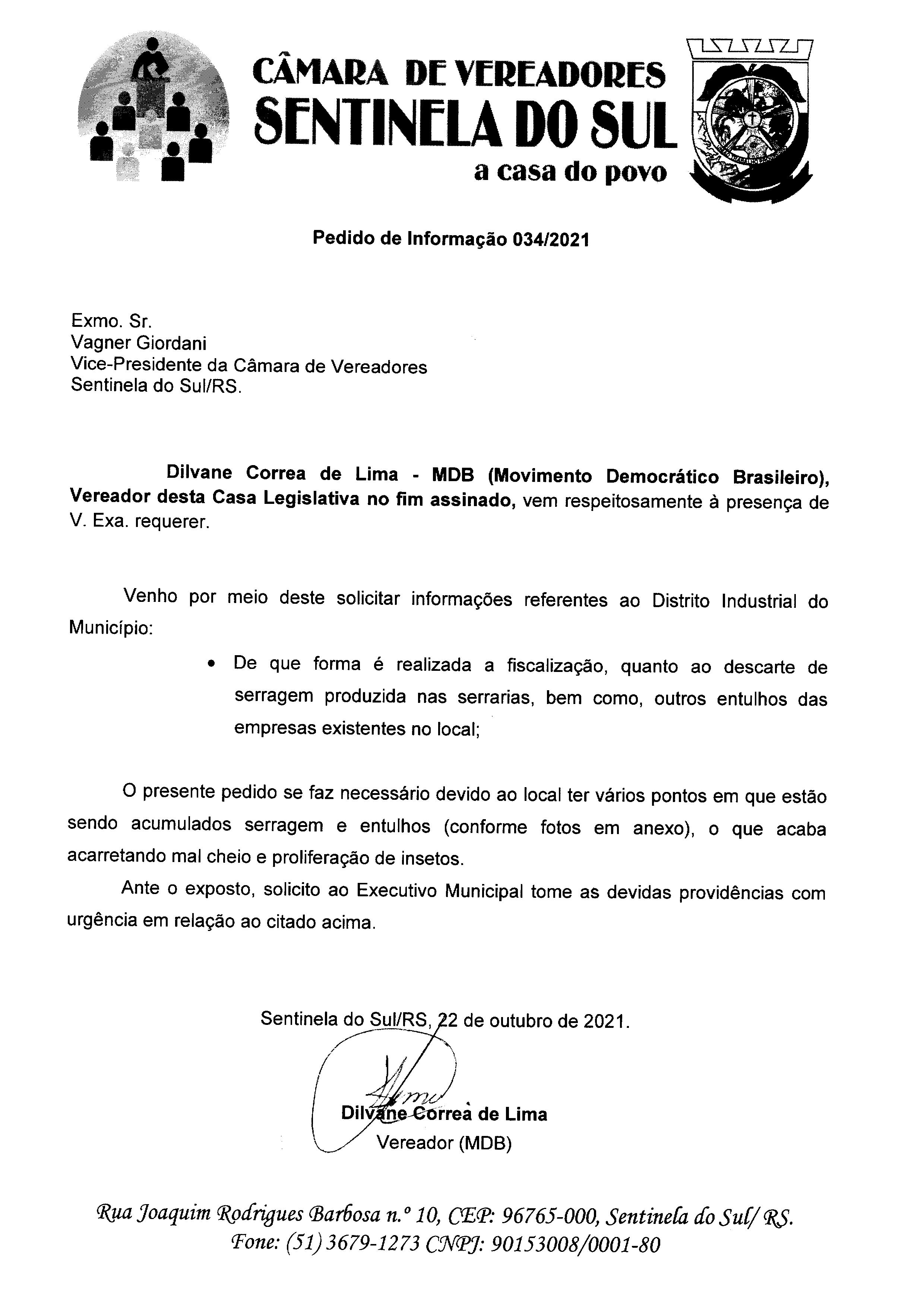 Pedido de Informação de autoria do Vereador Dilvane Correa de Lima