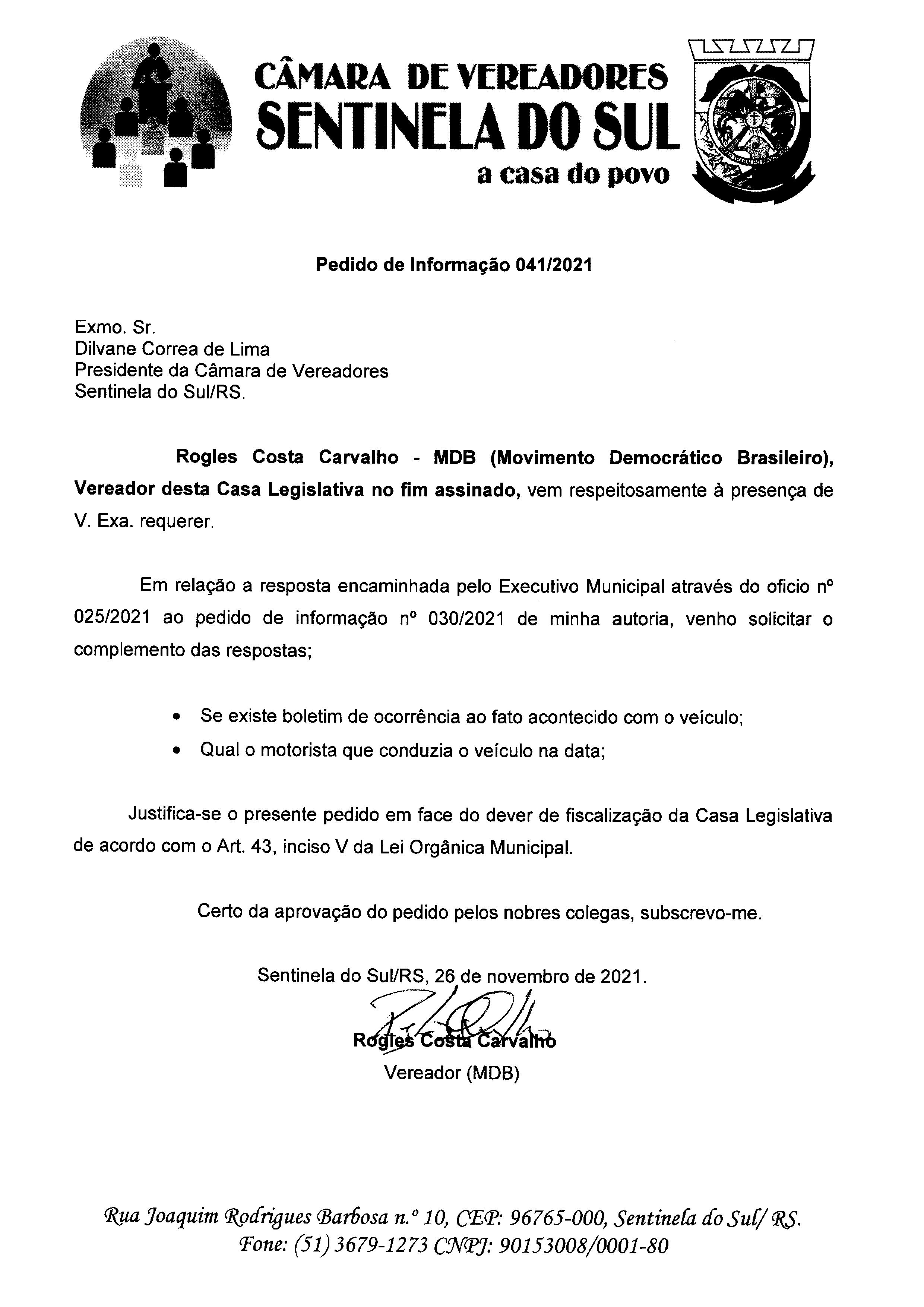 Pedido de Informação de autoria do vereador Rogles Costa Carvalho