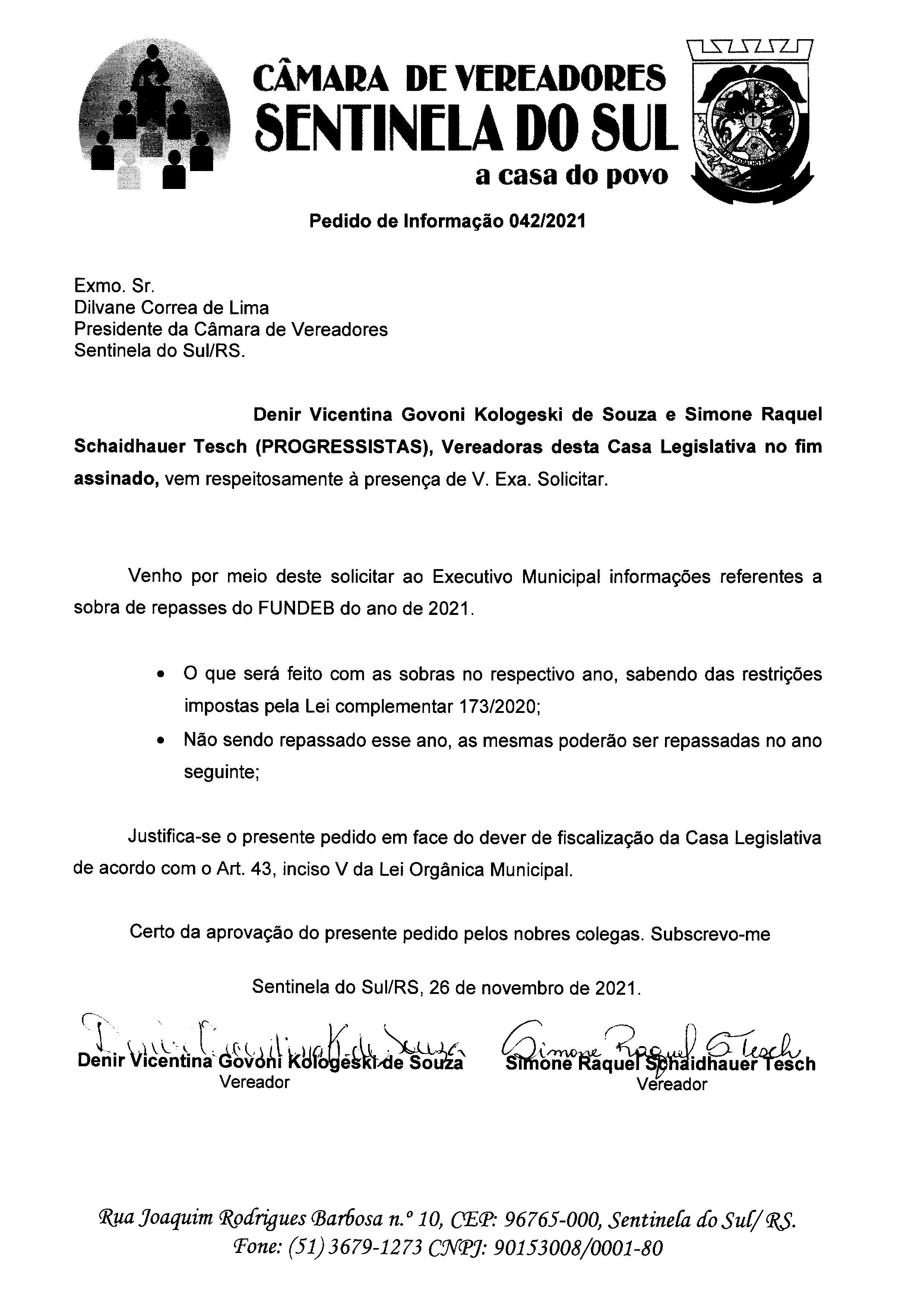 Pedido de Informação de autoria conjutna das vereadoras Denir vicentina Govoni Kologeski de Souza e Simone Raquel Schaidhauer Tesch