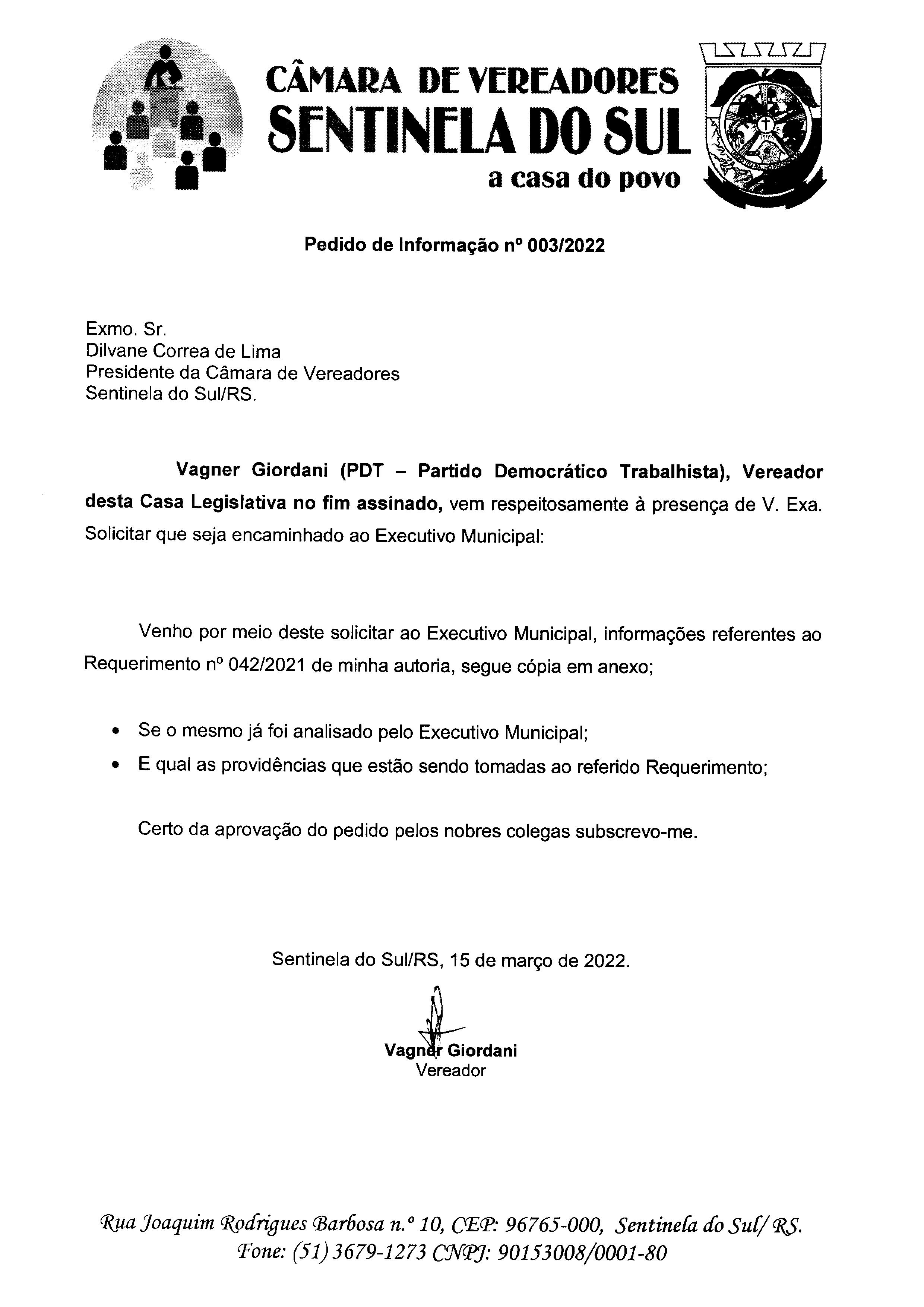 Pedido de Informação de autoria do Vereador Vagner Giordani