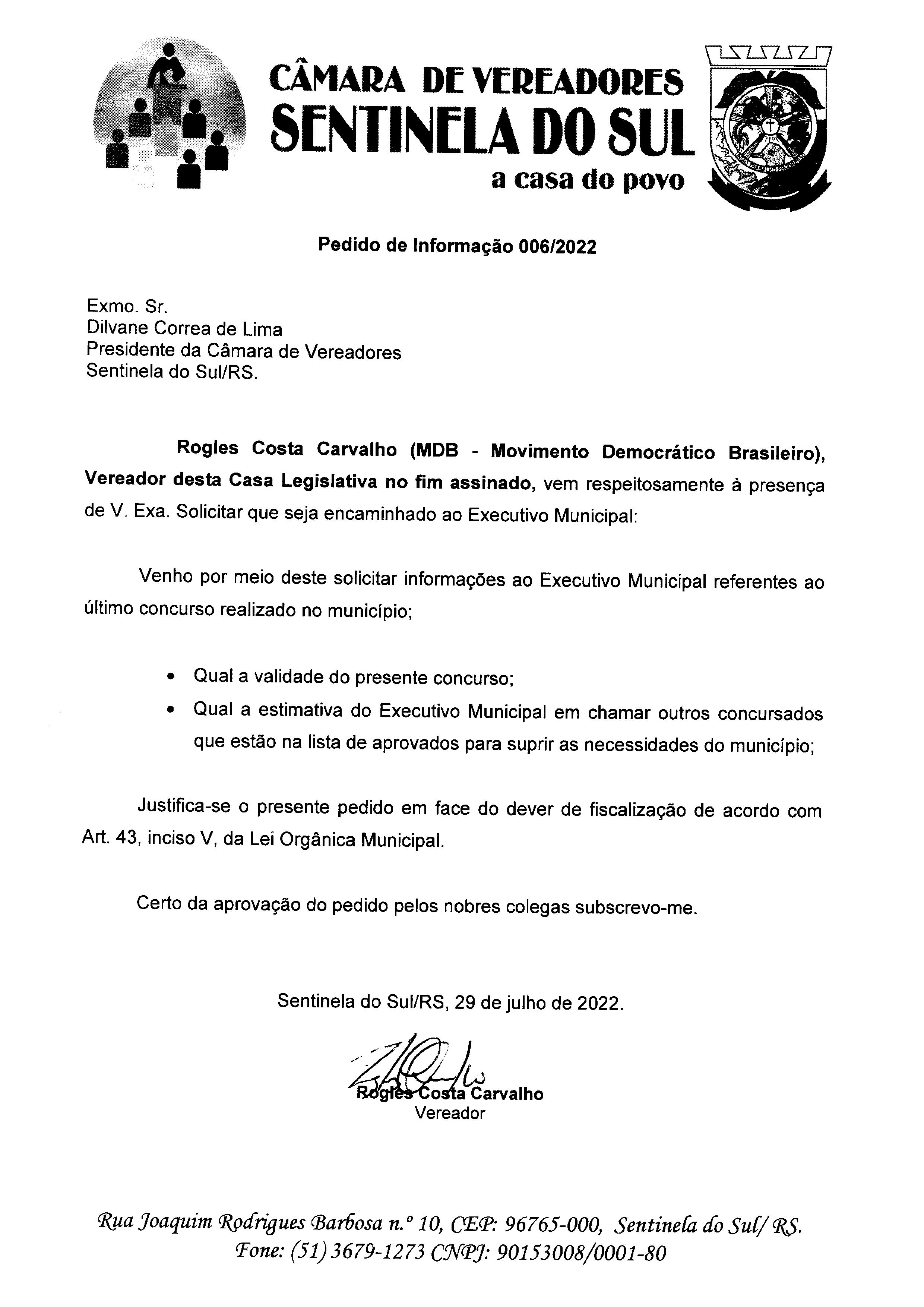 PEDIDO DE INFORMAÇÃO Nº 006/2022
