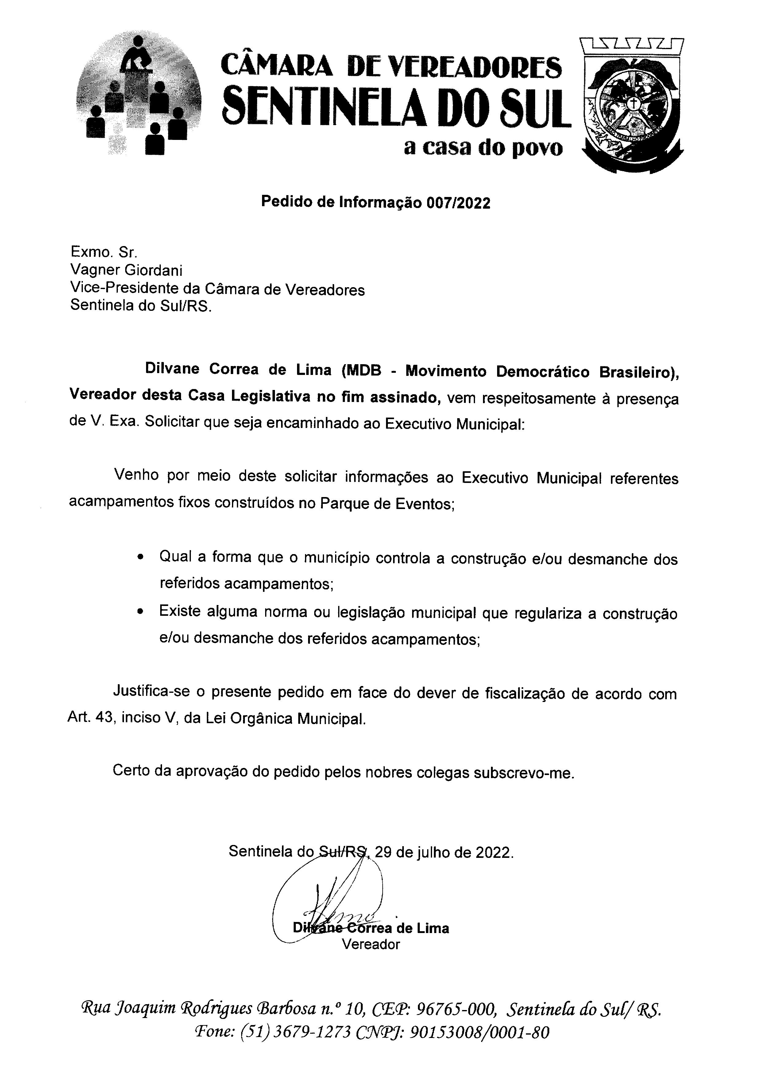 Pedido de Informação de autoria do Vereador Dilvane Correa de Lima