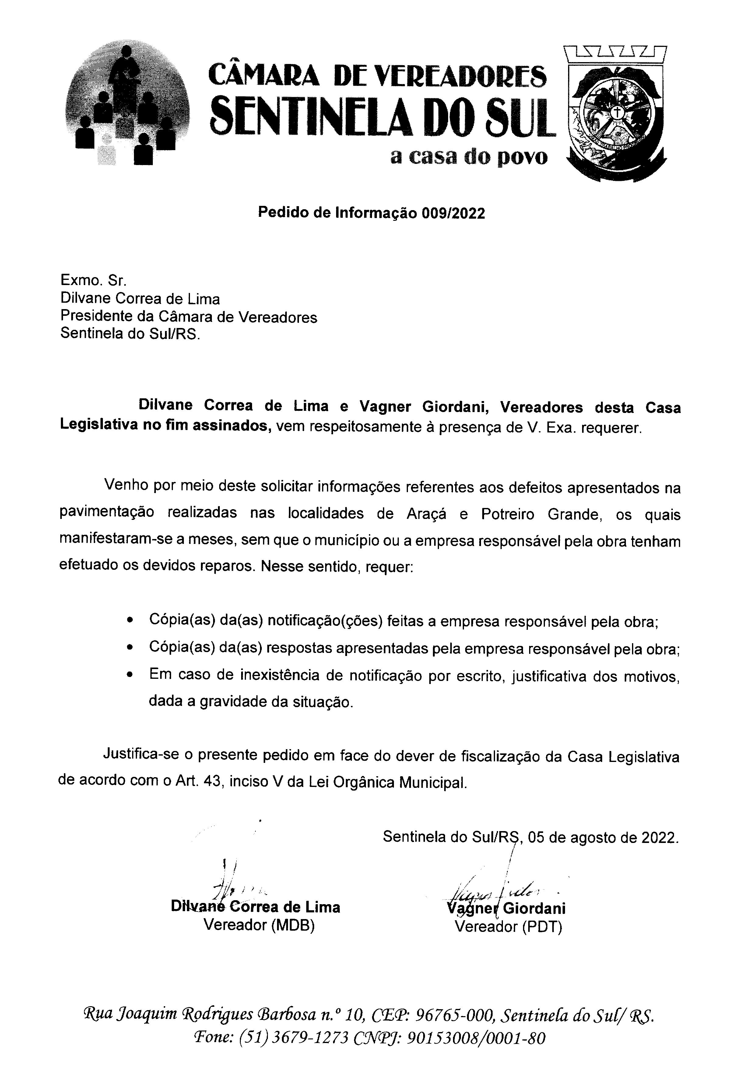 Pedido de Informação de autoria dos Vereadores Dilvane Correa de Lima e Vagner Giordani