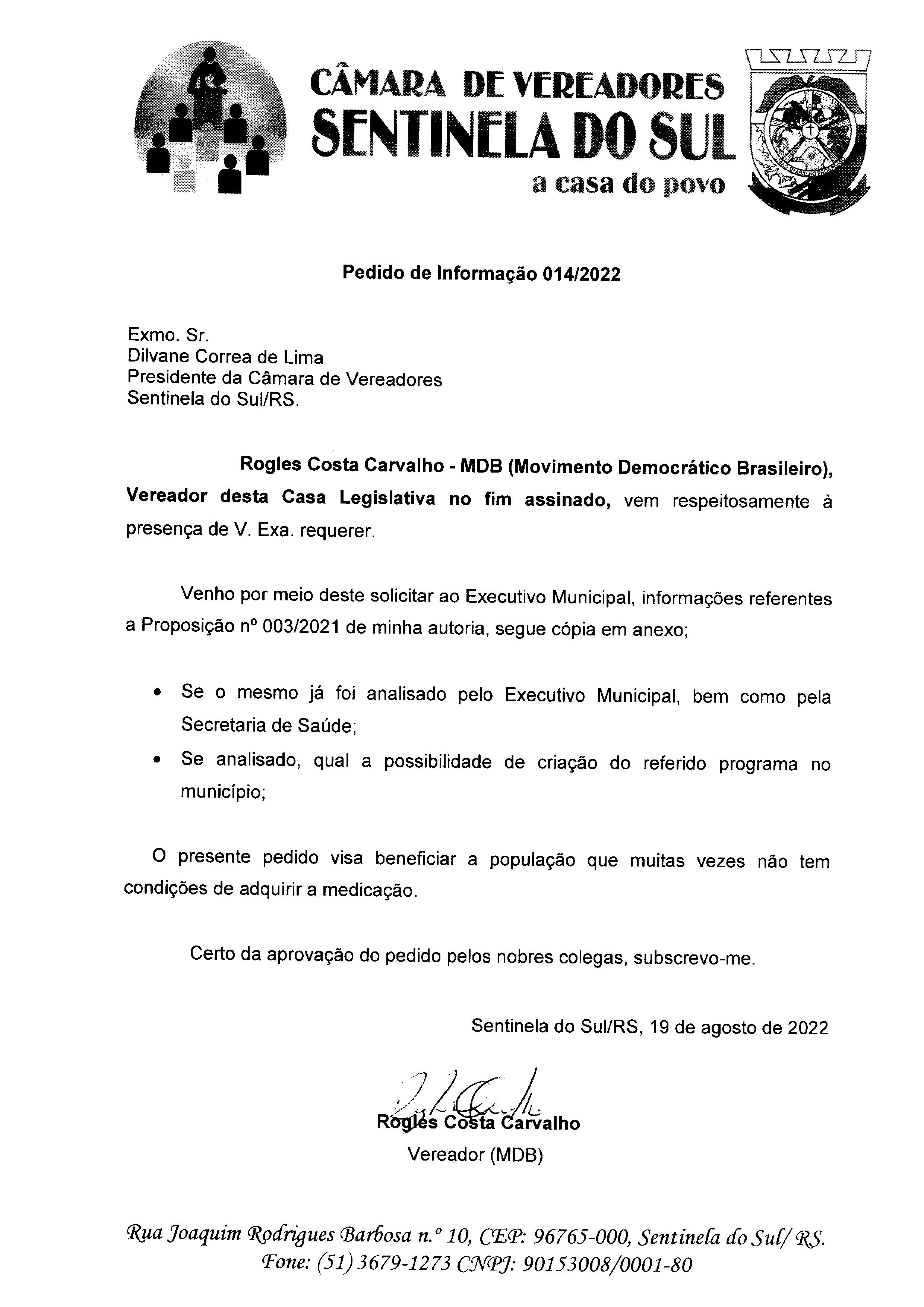 Pedido de Informação de autoria do Vereador Rogles Costa Carvalho