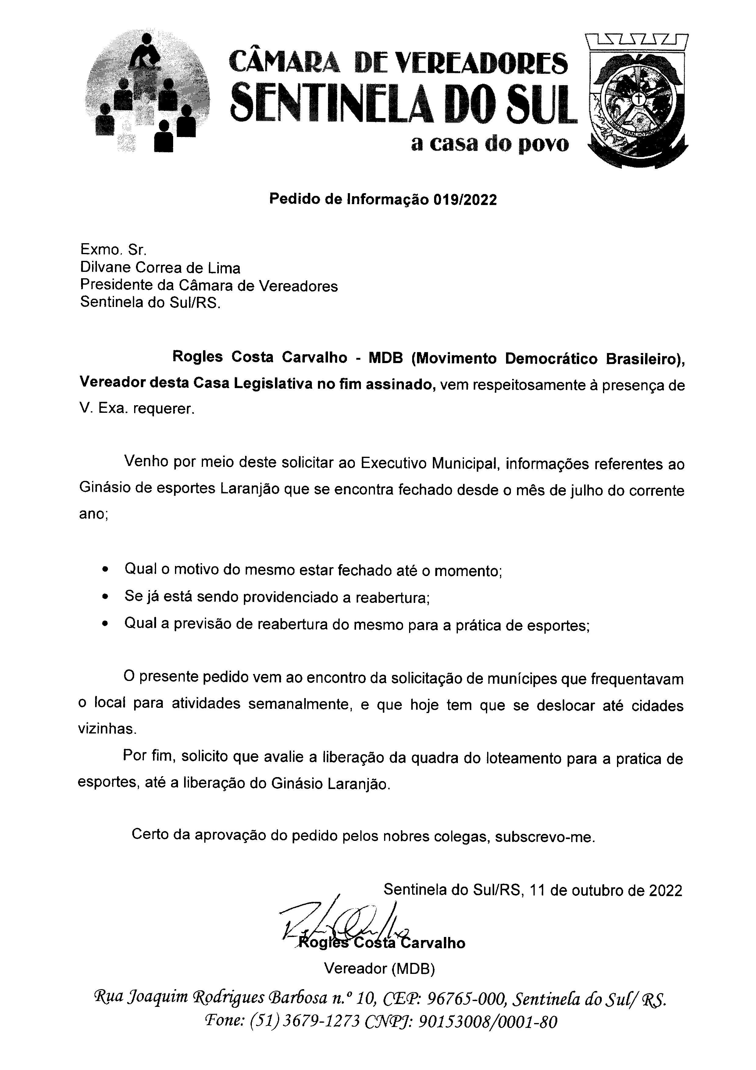 PEDIDO DE INFORMAÇÃO Nº 019/2022