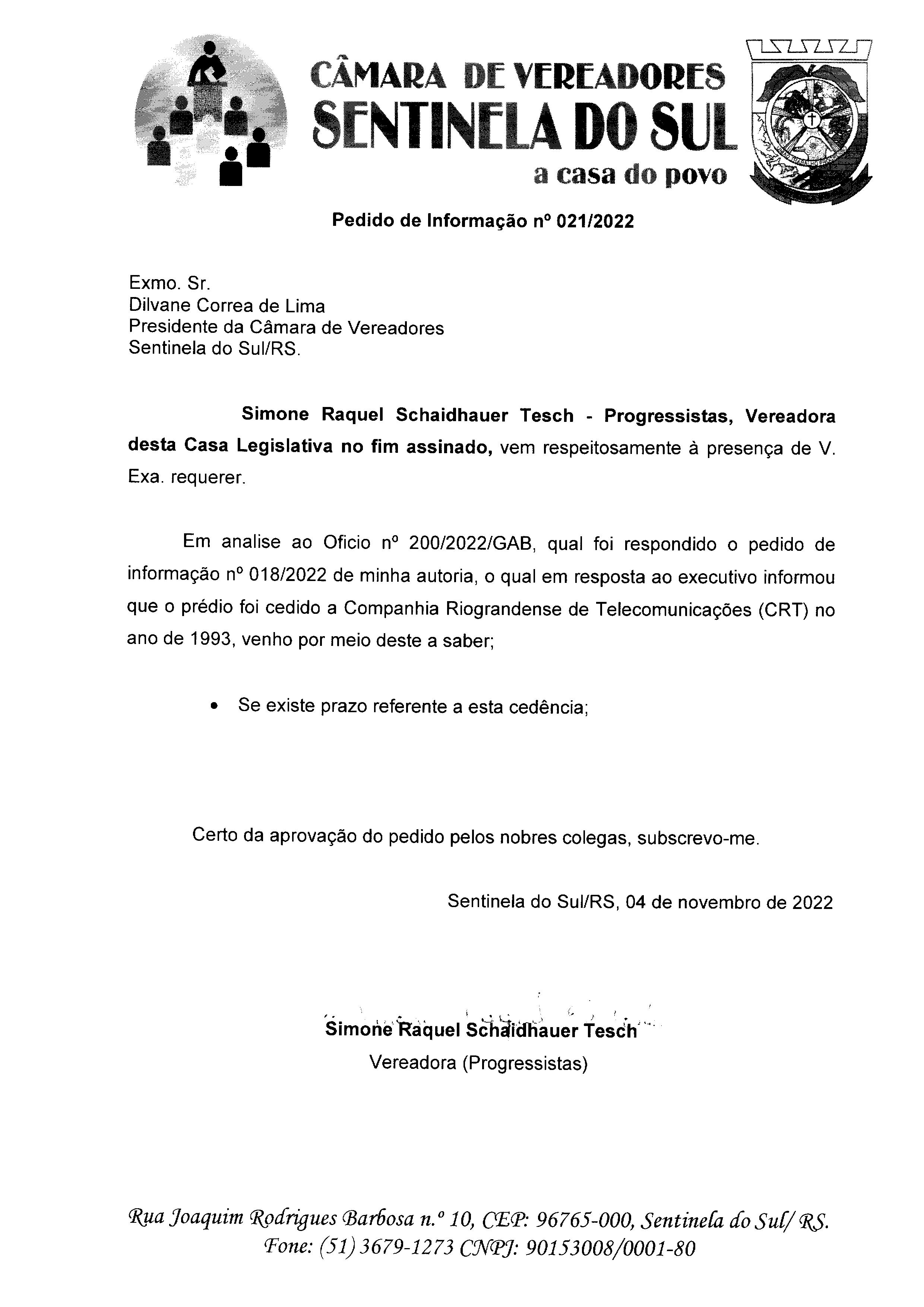 PEDIDO DE INFORMAÇÃO Nº 021/2022