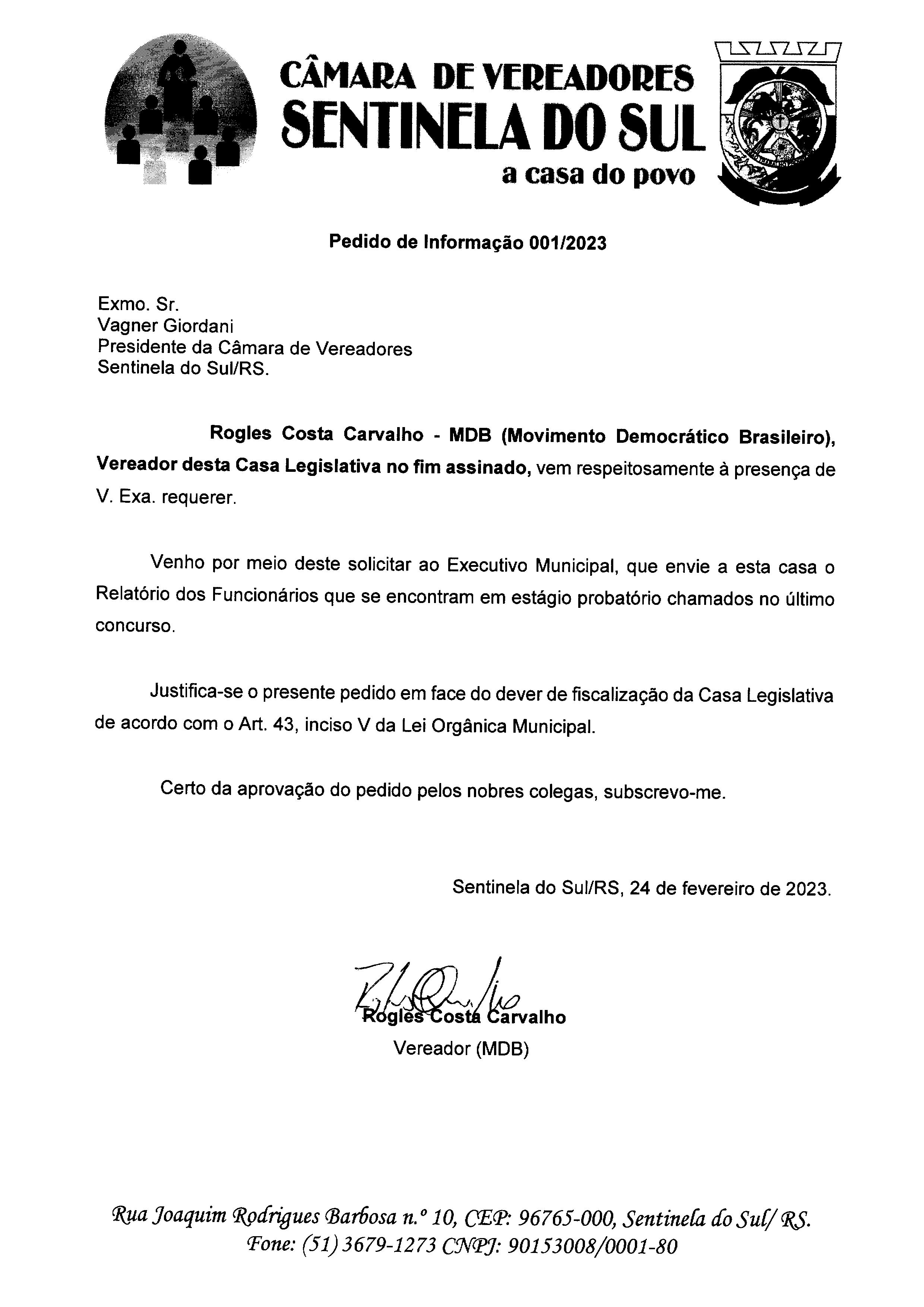 Pedido de Informação de autoria do Vereador Rogles Costa Carvalho