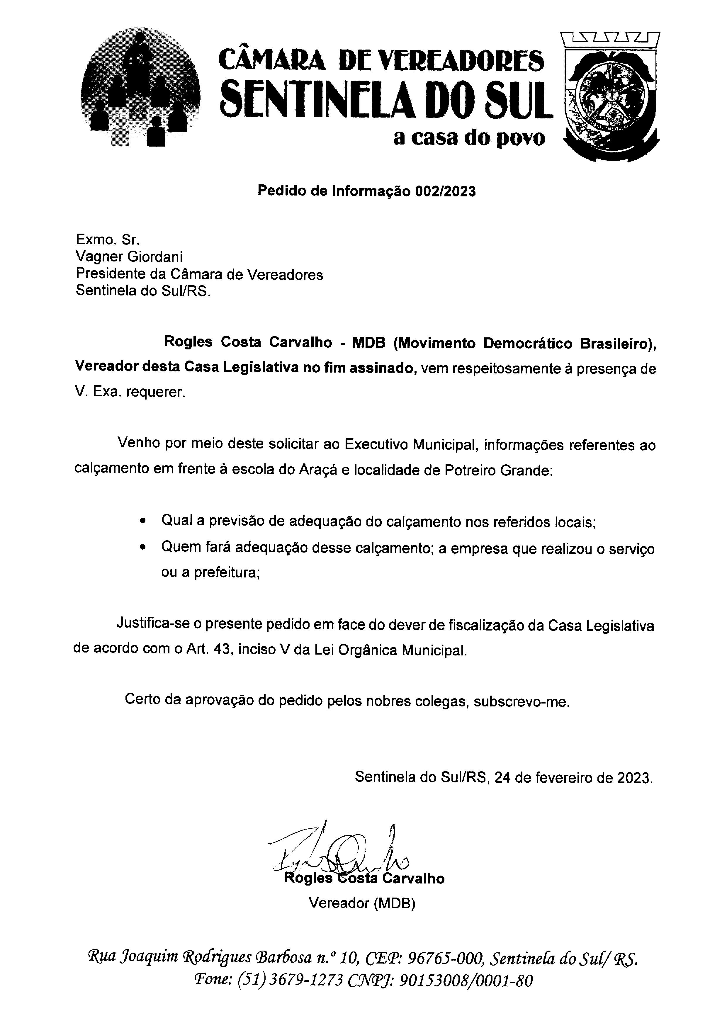 Pedido de Informação de autoria do Vereador Rogles Costa Carvalho