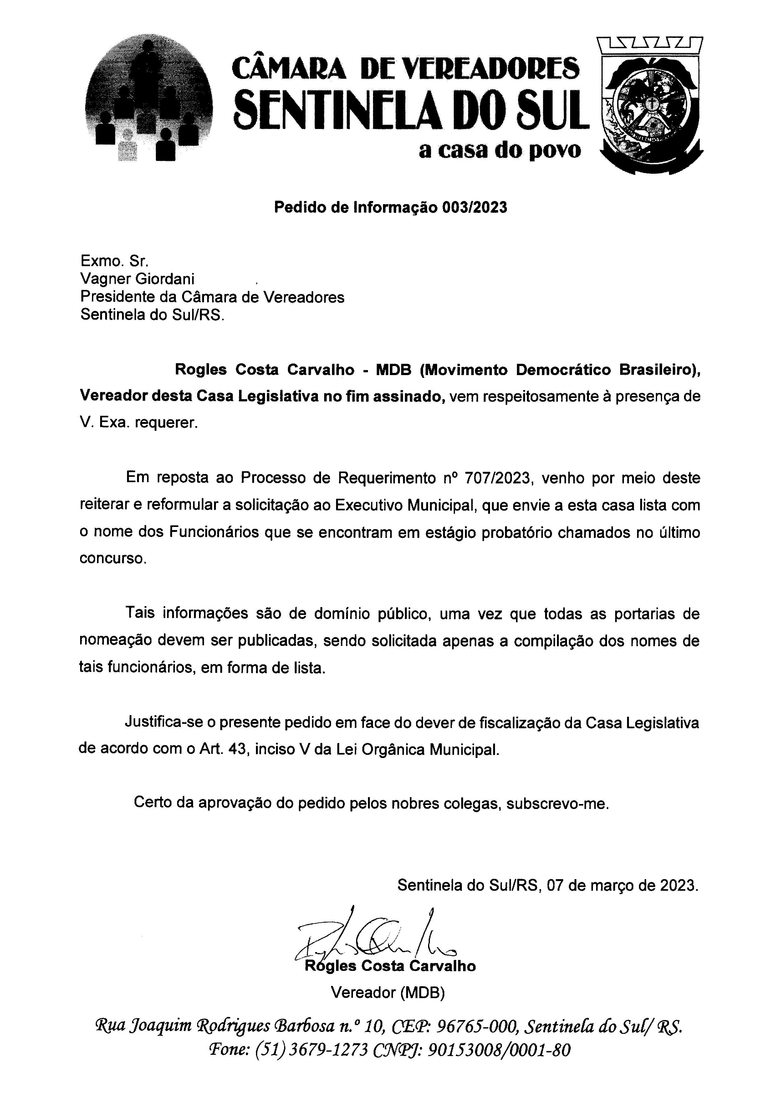 Pedido de Informação de autoria do Vereador Rogles Costa Carvalho