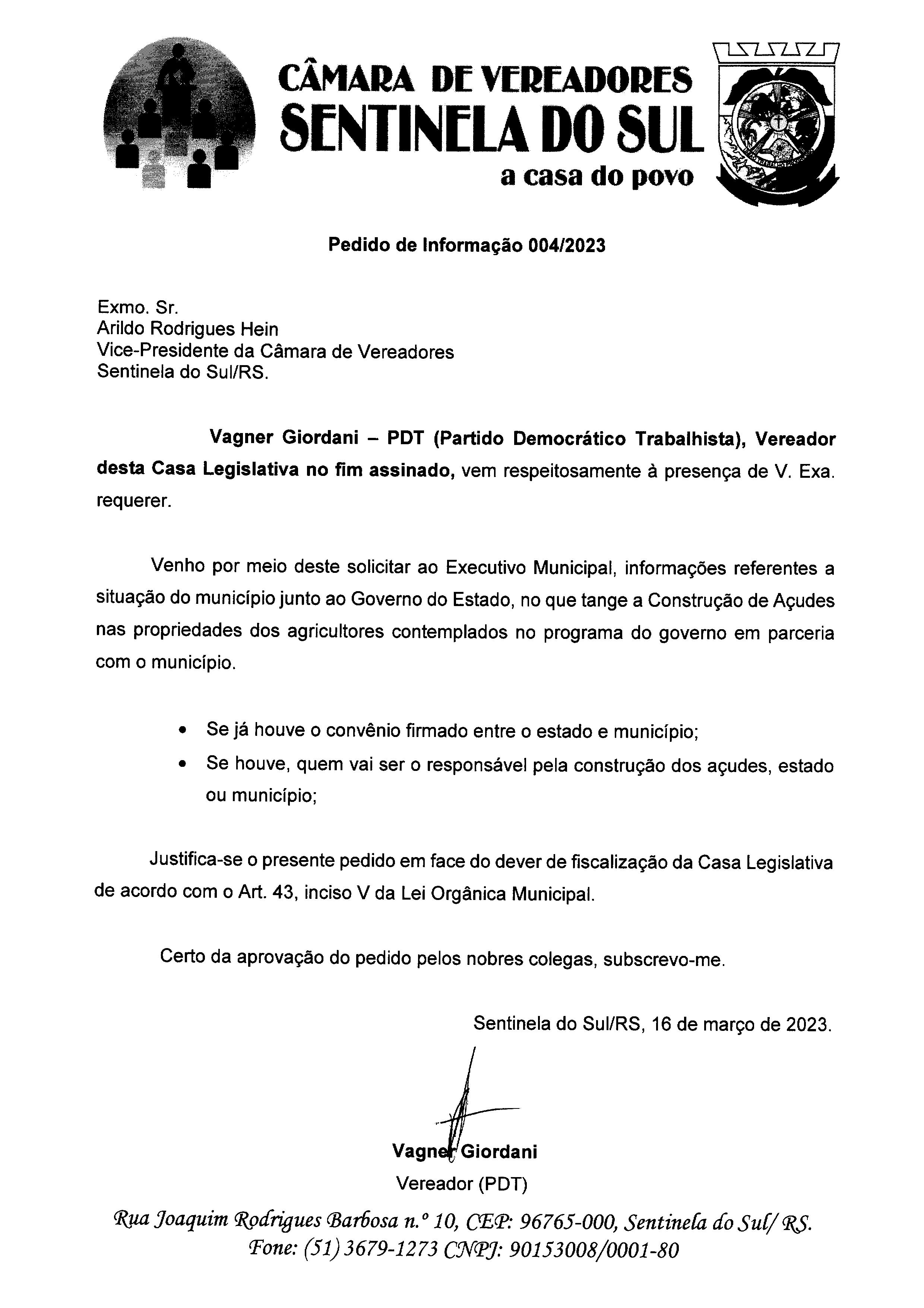 Pedido de Informação de autoria do Vereador Vagner Giordani